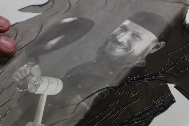 Lo strumento al quale Monteriso ha affidato la memoria dei suoi scatti è una macchina a banco ottico grande formato del secolo scorso, per intenderci il successore della camera oscura, quest’ultima utilizzata fin dal Rinascimento dai pittori come aiuto per la realizzazione di articolati disegni prospettici. Uno strumento complesso che richiede una grande padronanza tecnica anche perché la figura appare all’occhio del fotografo invertita destra sinistra e capovolta. L’empatia che si instaura durante una sessione di posa permette a Monteriso di sentire il momento adatto per lo scatto. È proprio allora che viene azionata la peretta e immortalato per sempre, sul supporto fotosensibile, il ritratto del personaggio. Un unico scatto perché unica è la lastra inserita nello chassis. La sensibilità artistica di Marco Monteriso si percepisce maggiormente dopo lo sviluppo della pellicola, quando l’emulsione sarà staccata dal supporto originario, delicatamente stesa su uno nuovo e lavorata sapientemente dalle mani dell’artista/fotografo. Nei ritratti in mostra Monteriso ha privilegiato come supporto dell’emulsione fotosensibile dei fogli di carta acquerello ma le sue sperimentazioni hanno spaziato dal gesso ai blocchetti di porfido, dalle foglie di avocado fino al legno e al caolino.