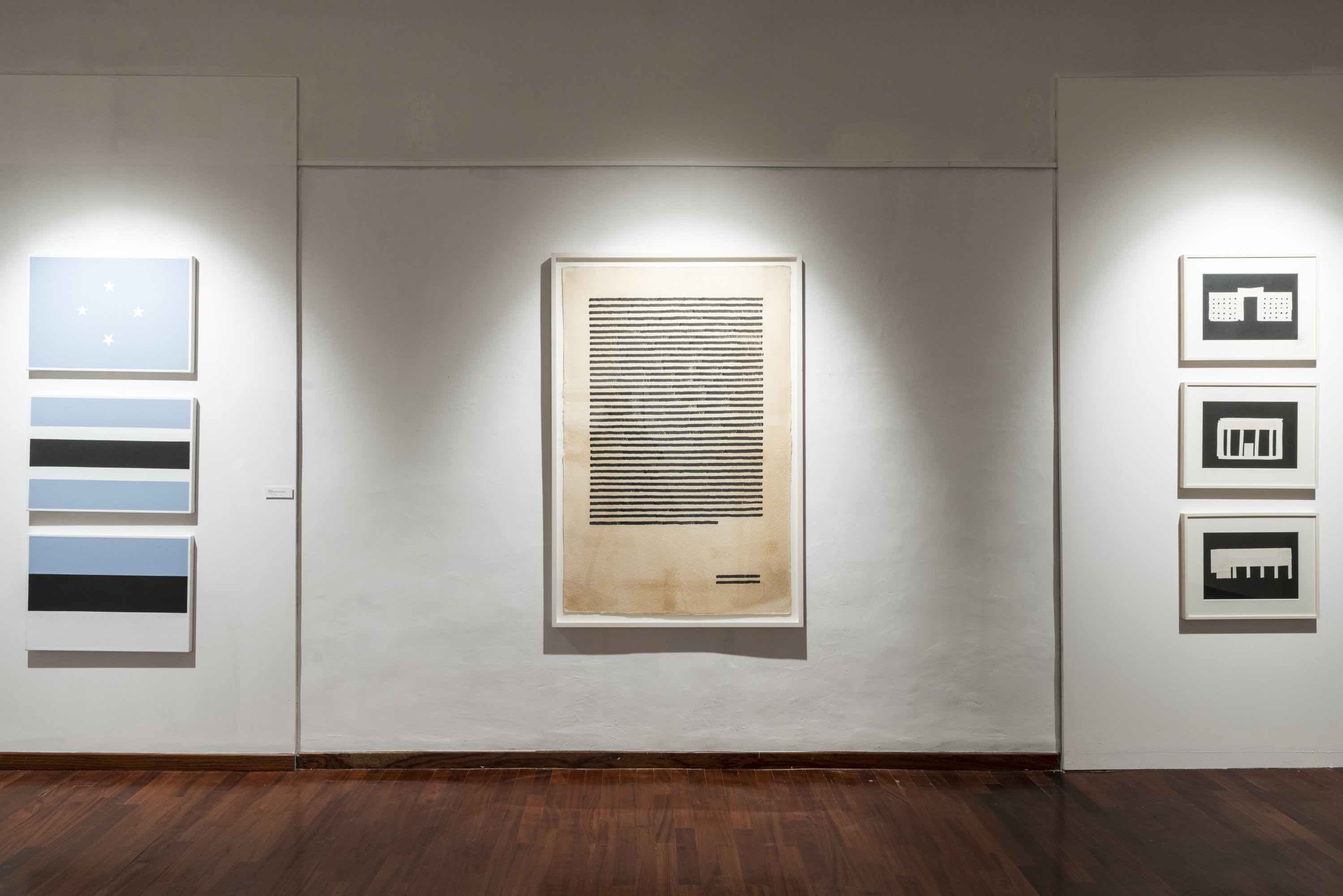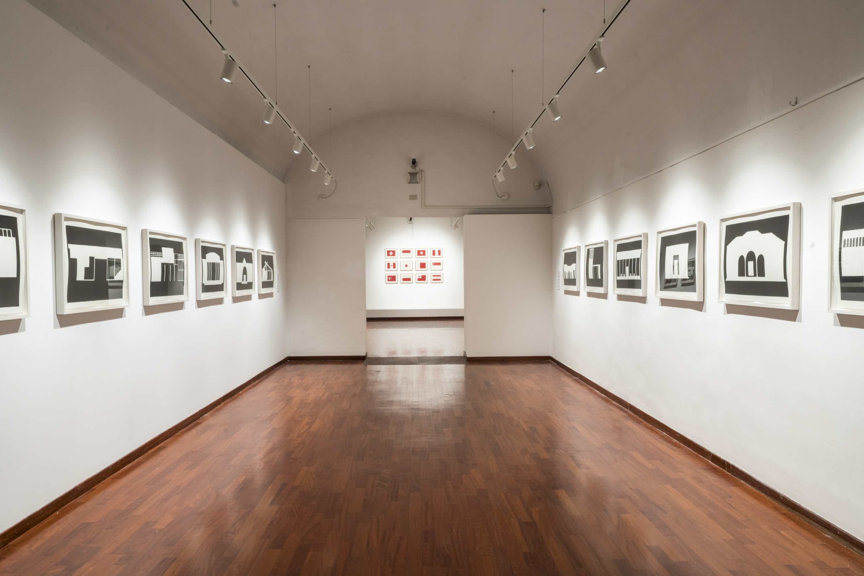 La mostra si compone di oltre quaranta opere, che variano per tecnica e tema: dalla tempera su carta del 2007 (Magna Carta), alla serie dei padiglioni del 2010 esposta nella sua interezza, formata da 26 tempere su carta e fino alla prima serie composta da 3 opere realizzate con lo scotch.