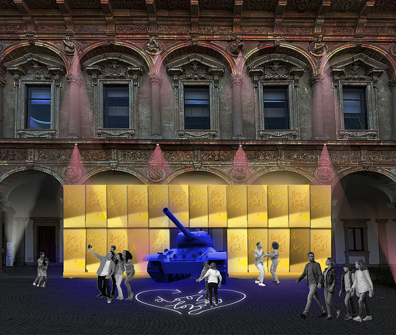 “Door is Love” è un progetto di Marco Nereo Rotelli che “apre un varco” verso un mondo senza guerre. L’opera consiste in un grande Portale d’Oro, allestito nel Cortile d’Onore dell’Università degli Studi di Milano, formato da una serie limitata di porte incise con versi poetici sui concetti dell’amore, che si fondono con un carro armato dipinto di blu.