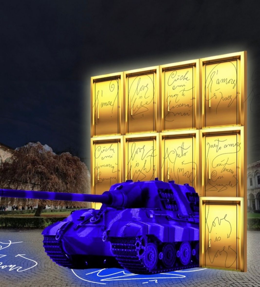 “Door is Love” l’installazione di Rotelli è una provocazione, dove arte e design si uniscono per portare un messaggio di pace”, dischiara l’architetto Celia Stefania Centonze. Vedremo un carro armato dipinto di blu ed un Portale dorato che lo disarmerà per fermare le guerre.