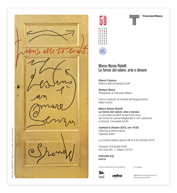 La mostra approfondisce la dialettica tra valore poetico e valore economico attraverso il medium privilegiato dall’artista: la parola. Nella prospettiva interdisciplinare che caratterizza la ricerca di Rotelli, filosofia, letteratura e poesia divengono i cardini di una riflessione su denaro, arte e società. L’inaugurazione della mostra, introdotta da Gianni Canova, Rettore dell’Università IULM, Stefano Boeri, Presidente di Triennale Milano e Lorenza Baroncelli, Direttore artistico di Triennale Milano, si svolgerà l’8 ottobre alle ore 19.00 presso il piazzale dell’edificio IULM 1.