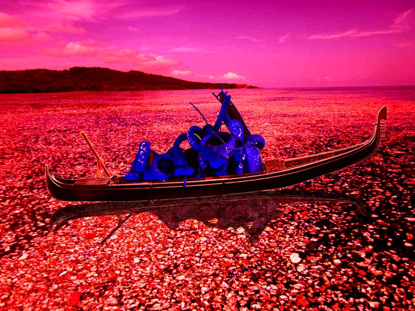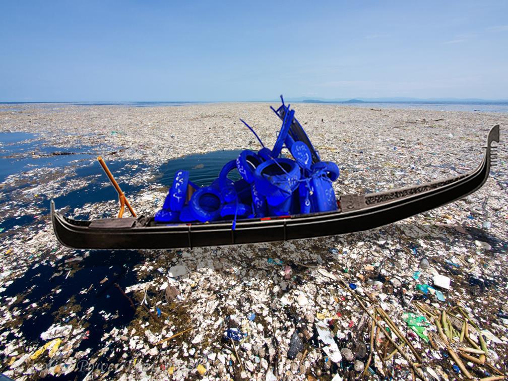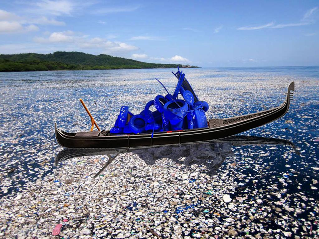 La gondola, che nell’immaginario collettivo rappresenta il romanticismo, l’amore e la bellezza, assurge con questo pro- getto a luogo del nuovo essere. Naviga con il suo messaggio verso Milano, dove sarà esposta nel Cortile d’Onore del ‘600 dell’Università Statale di Milano in occasione della Design Week per Interni Design Re-Generation. Gli oggetti riemersi dipinti da Marco Nereo Rotelli di blu Klein, il colore dell’infinito, sovrastano la gondola, la cui rotta irreversibile è un mare pulito.