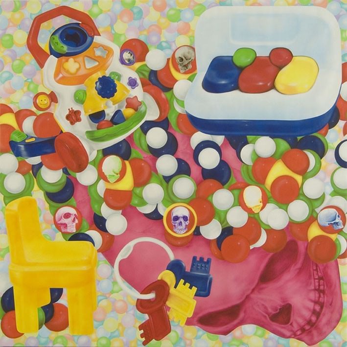 L’artista si muove tra pezzi di realtà, tra icone e miti, dando vita a giochi intellettuali, ready-made, papier-collé, tagliando e incollando, copiando e spostando con le possibilità offerte dalle tecnologie più avanzate. Tecnica iperrealistica e colori acrilici, cromie acide, fluò, metalliche o plastiche, toni neri violacei e gelatinosi accompagnano la rappresentazione di un mondo popolato da icone, oggetti feticcio, personaggi di “fantasyland”, giocattoli rotti o nuovissimi, bambole e orsacchiotti, cartoons e favole, biglie traslucide ma anche simboli dell’ermetismo neoplatonico. L’artista attua una protesta contro il mondo dei consumi e la reificazione delle merci, come quando riempie di bottiglie vuote frigoriferi neri simili a sarcofagi, innalzando i prodotti del mercato a livello di opera d’arte, il cattivo gusto a buon gusto, la pubblicità alla pittura da salotto, il fumetto al rango di Storia.