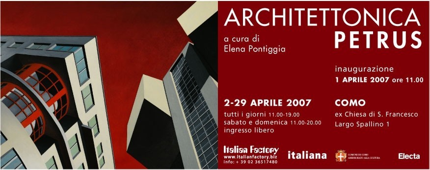Una delle sezioni dell’esposizione sarà dedicata al confronto tra l’Architettura Razionalista e il Costruttivismo russo; nell’Ex-Chiesa di San Francesco a Como, una delle città “trasformate” dall’architetto Giuseppe Terragni, le opere dipinte di Petrus racconteranno le due tradizioni architettoniche attraverso un percorso espositivo e tematico che prenderà forma dalla Casa del Fascio al Circolo Operaio di Mosca, da Giuseppe Terragni agli architetti russi Konstantin Mel’Nikov e Golosov.