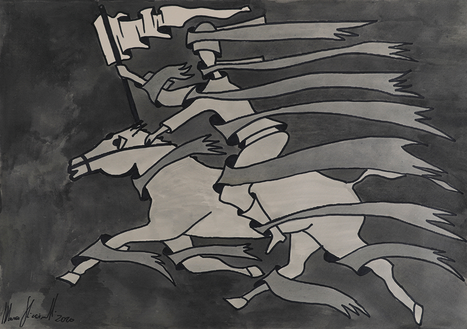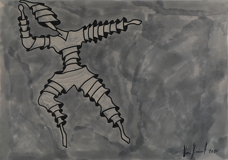Figure mute, asessuate, emblematiche e diafane, definite dalla sola linea della silhouette, appaiono come spiriti nudi, ricoperti da tessuti che li avvolgono e avvinghiano, imprigionandoli strettamente con le loro significative e limitanti cuciture; anime o spiriti che vagano in uno spazio senza luogo e senza tempo alla ricerca di una loro significativa collocazione e liberazione.