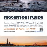 Dal 25 al 30 aprile 2023 apre “SUGGESTIONI FLUIDE” esposizione personale di opere di MARCO RONGA ispirate alle suggestioni dell’acqua, presso Spazio BIOSFERA, nel Ghetto di Padova. La riflessione prende il via dalla natura ambigua dell’acqua, superficie riflettente e deformante della realtà.