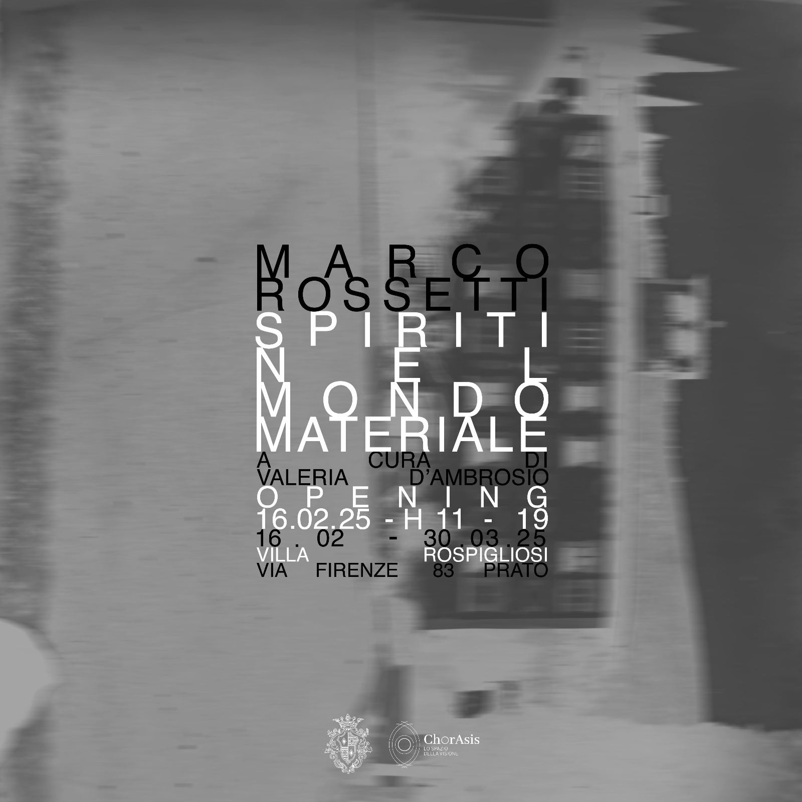 ChorAsis è un’associazione culturale di sostegno agli artisti, sperimentazione, produzione e promozione di forme d’arte contemporanea con sede presso la settecentesca villa Rospigliosi di Prato, nata dall’incontro di interesse, sensibilità e passione fra Claudio Seghi Rospigliosi, Riccardo Farinelli, Carla Carbone e altri appassionati volontari. Il progetto di ricerca indaga sulle relazioni tra il passato e il presente, in dialogo tra arte, natura e storia e in costante rapporto di interazione con il territorio. Punto focale la cura del processo creativo, gli artisti sono invitati a rapportarsi liberamente con gli ambienti della villa e il suo parco giardino nella creazione site specific di opere e interventi installativi, performativi, laboratoriali. Una pubblicazione annuale raccoglie i progetti artistici realizzati documentando il percorso creativo nelle sue diverse fasi. Dal 2019 ChorAsis ha sostenuto i progetti espositivi di Riccardo Farinelli, Qui Yi, Ignazio Fresu, Giovanni Termini, Carlo Colli, Serena Fineschi, Myriam Cappelletti, Gloria Campriani, Cristina Gozzini, Antonello Ghezzi, Luca Matti, Chiara Bettazzi, Pantani-Surace, Cristian Chironi, Antonio Barbieri, Giovanni Presutti, Franco Menicagli, Andrea d’Amore, Antonio Fiorentino, Roberto Pupi, Loredana Longo, Eric Michel.