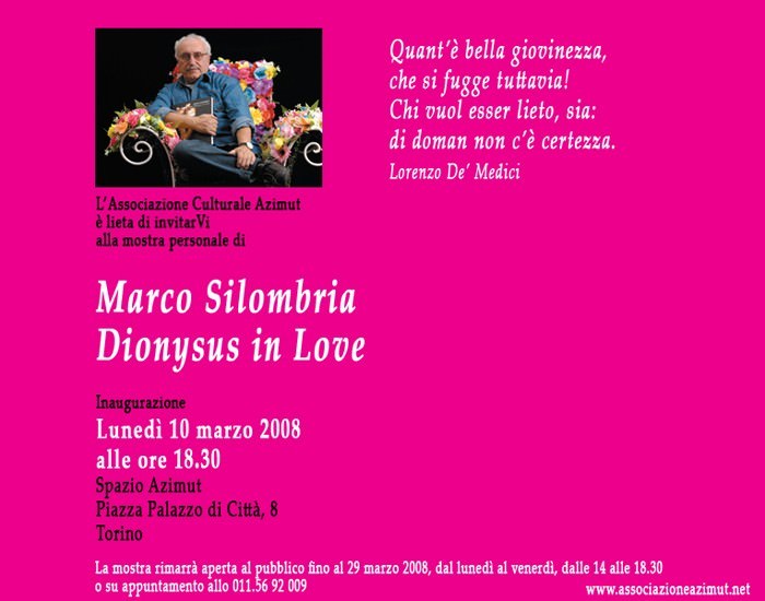 L’Associazione Culturale Azimut con il sostegno di Regione Piemonte, Fondazione CRT e Camera di commercio di Torino e con il patrocinio della Città di Torino presenta la mostra personale Dionysus in Love dedicata all’artista di fama internazionale Marco Silombria – www.silombria.com