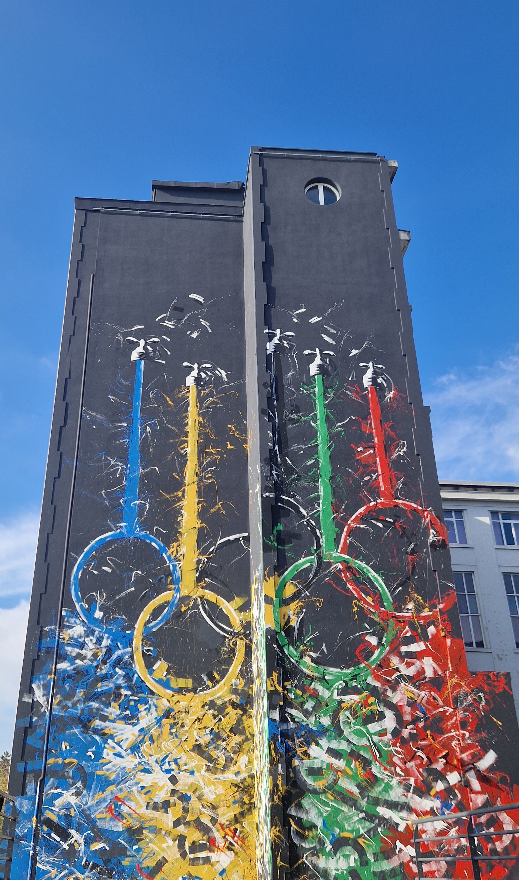Il murale raffigura cinque rubinetti, elemento iconografico ricorrente nel lavoro di Tamburro, da cui scorre acqua colorata che, trasformandosi in cerchi intersecati, forma il simbolo Olimpico. Nella parte inferiore, gli stessi colori si espandono su uno sfondo nero, generando un’esplosione di energia; con tonalità vivide e un segno pittorico rapido e deciso, guidato da una velocità di ideazione ed esecuzione che caratterizza la sua poetica, l’artista celebra la potenza del movimento, l’energia e la vita.
