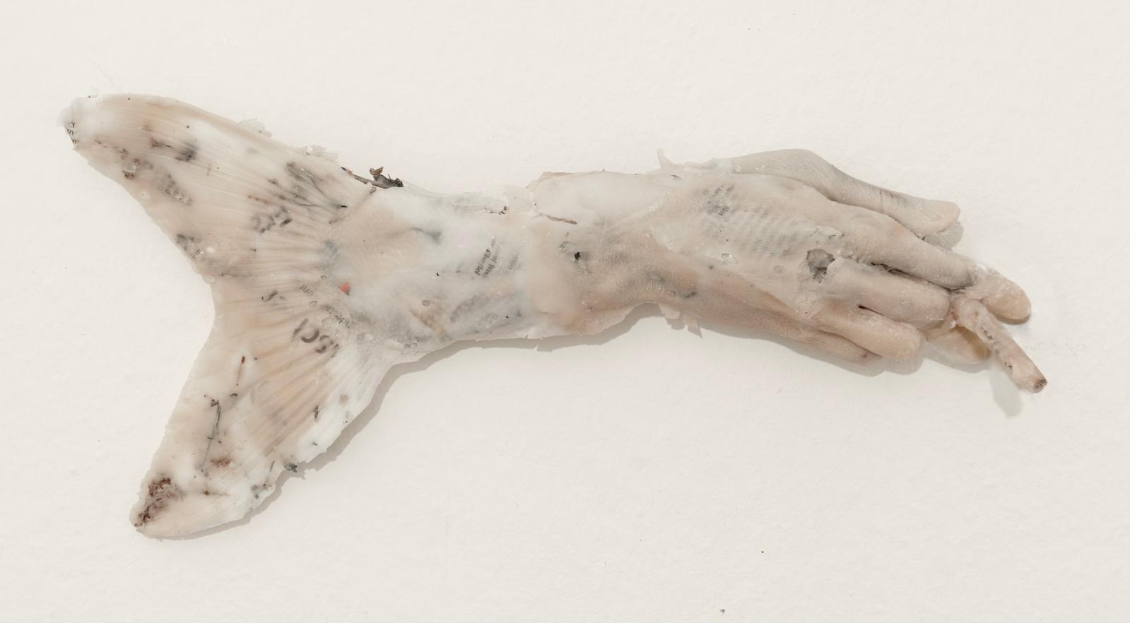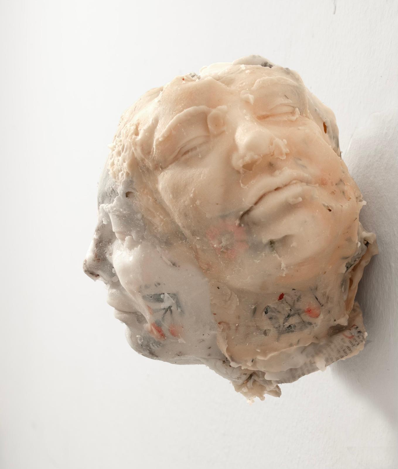 Matière Survivante si sviluppa attorno a una “tavola-tela” lunga cinque metri che ancora una costellazione di calchi in silicone: un paio di stivali vuoti all’ingresso, posate assorbite nei piatti, un giornale inglobato nel piano, fiori imbalsamati, “mani-pesce” fluttuanti e una testa umana bifronte. Lavorando con sottili pelli di silicone ottenute da stampi negativi, Compte-Mergier mette in scena l’after-image di un banchetto. La superficie fredda ed epidermica del materiale sposta la percezione dal puro vedere al tattile, dando forma a ciò che l’artista definisce una malinconia della catastrofe: un’ambivalenza intimamente moderna che anela al cambiamento mentre vi scivola passivamente.