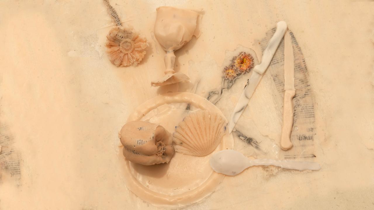 A Studio ORMA (26.09–24.10.2025), Margaux Compte-Mergier presenta Matière Survivante: un’installazione site-specific che dispone calchi cavi in silicone— stivali, posate, fiori, teste — attorno a una tavola-tela di 5 metri (anch’essa in silicone), esplorando la “malinconia per la catastrofe”.