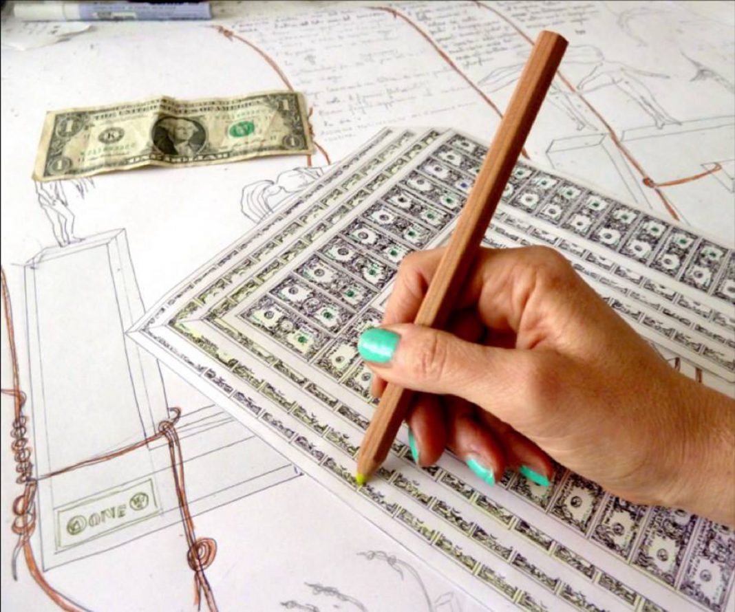 I disegni nascono come rappresentazione di prototipi di grandi opere in cui le parole sono costituite di dollari immersi in una lastra trasparente, parole che pendono sospese dall’alto su filo di rame. Alcune delle opere sono state esposte al L.U.C.C.A, Museo di arte contemporanea (maggio 2014).