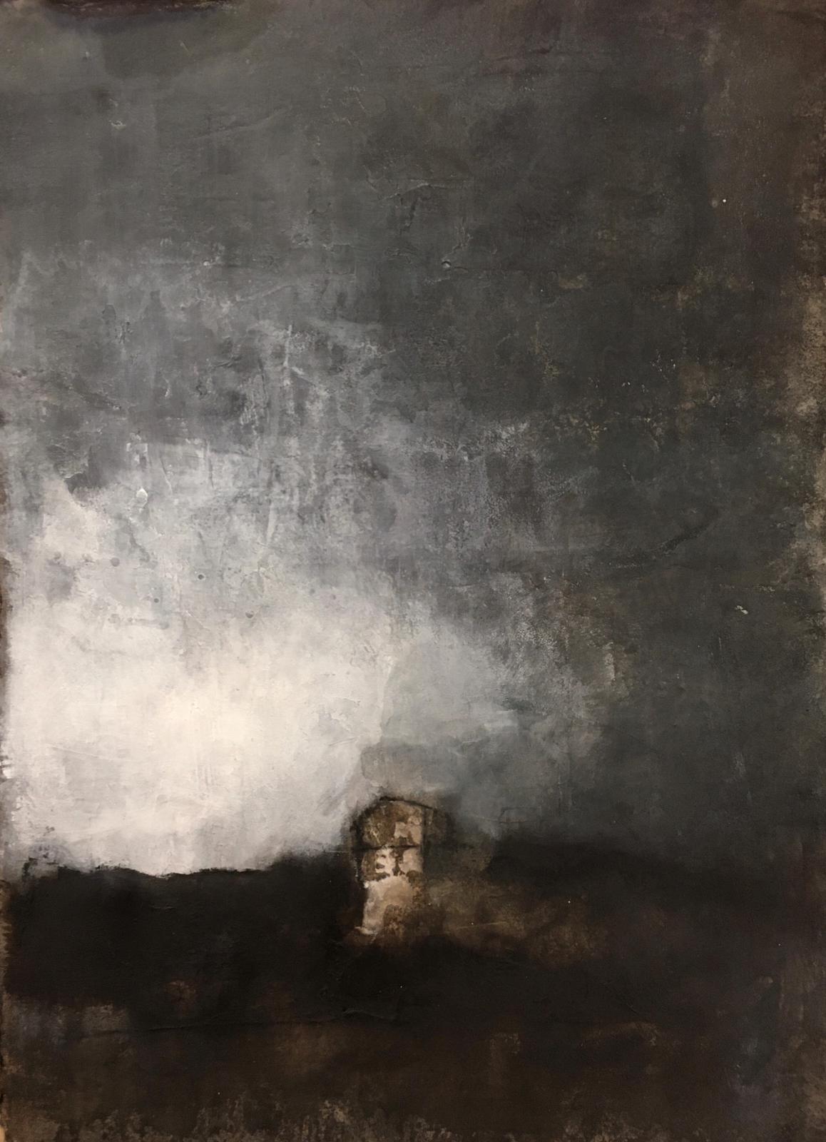 Con la figura umana, rappresentata sempre in modo essenziale e stilizzato, vuole raccontare una specie consunta, ridotta all’osso, simbolo della precarietà della condizione umana. Come per un desiderio di fuga da questa consapevolezza, nasce il bisogno di abbandonarsi a oniriche raffigurazioni urbane, a contemplazioni di paesaggi immaginari, sfumati tra strati di nebbie. Su questi scenari rarefatti si abbattono esplosioni di luce, che sovrastano ogni opera dell’uomo e della natura. Sembra quasi un intervento del “divino”, una forza trascendente che annichilisce e mette a nudo le fragilità. E come in un cerchio, le opere si riverberano con una personale e sgomentata riflessione sulle difficoltà dell’esistenza e sull’impossibilità dell’uomo di cambiare il corso degli eventi.