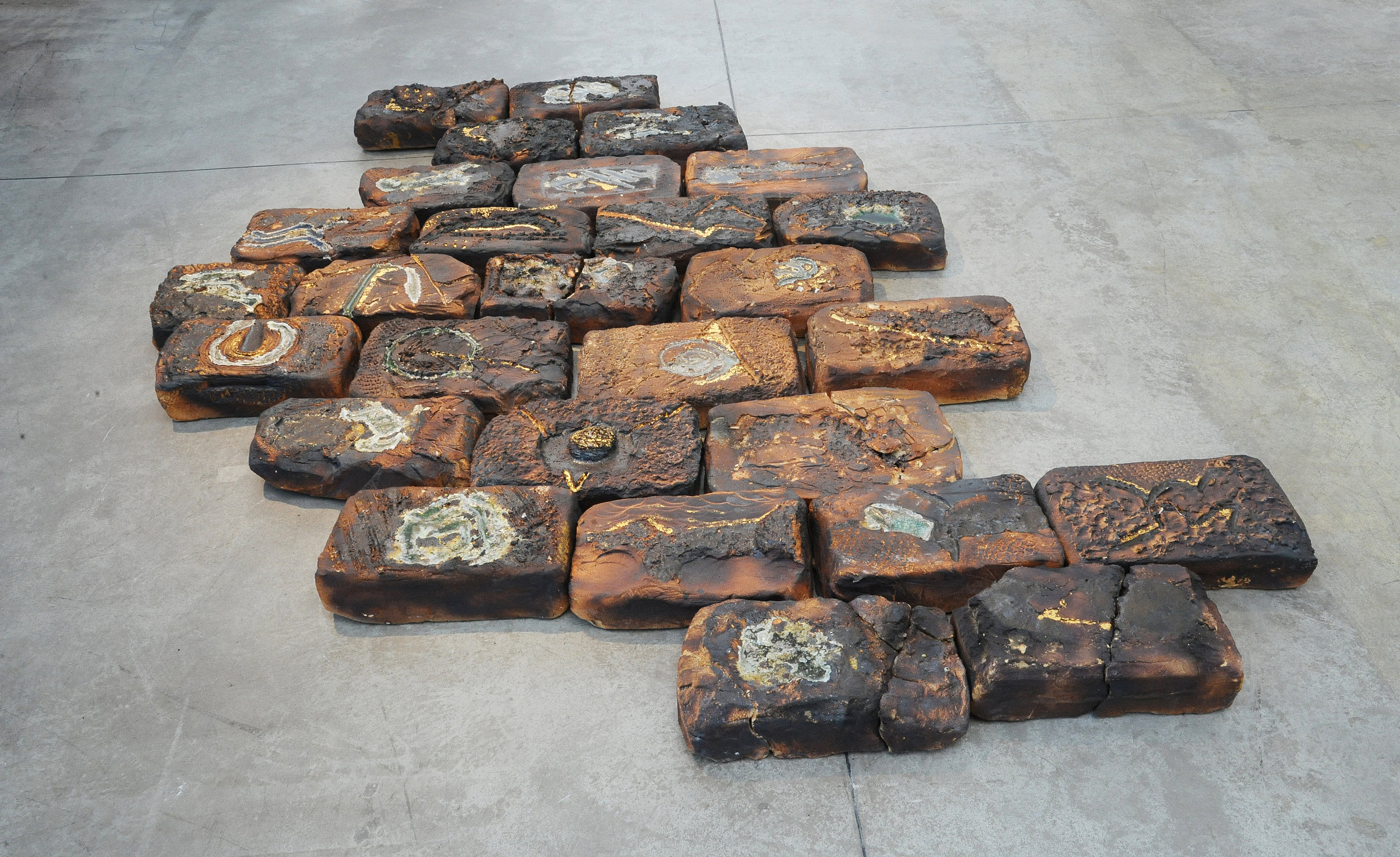 Mentre nella cripta una sequenza di Impronte recano incise nella materia alfabeti e vestigia di una presenza passata e si distendono al suolo, visibili dalla navata come resti di un'archeologia sepolta nella terra, nelle stanze destinate un tempo allo studio di Messina, le installazioni ambientali distillano due cicli importanti di Carlini, i Crateri e i Libri bruciati. Qui, il senso della materia e del colore, la pelle vibrante della scultura, gli smalti e gli ossidi plasmano elementi sottratti alla natura e alla storia dell'uomo, alla orografia del territorio e alla cultura ancestrale.