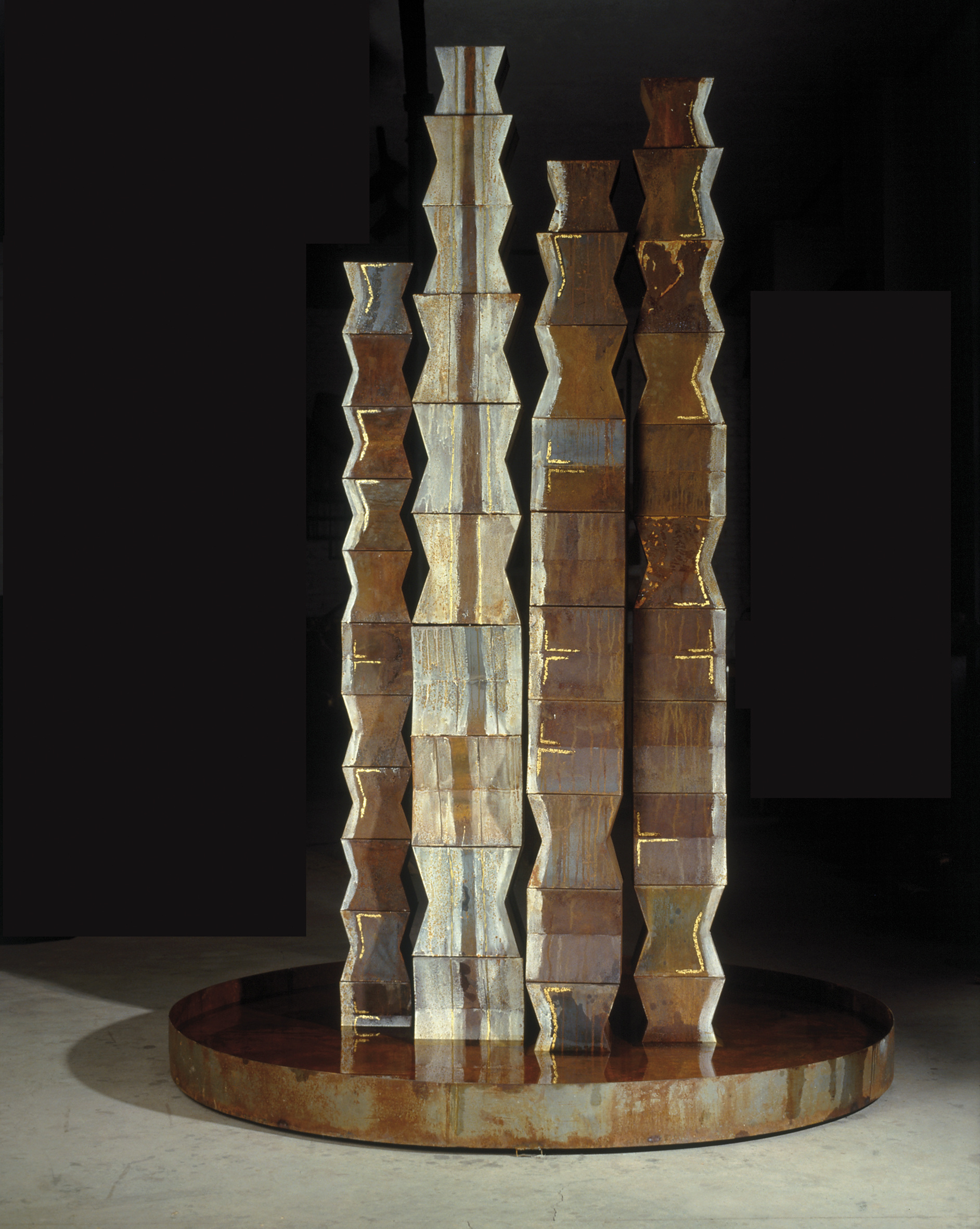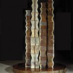 Il tema della germinazione di un modulo all'infinito nutre colonne della conoscenza che si arrampicano nelle cappelle laterali. Lamiera e piombo distillano energia e potenza semantica nelle pagine dipanate nell'aria come una stele o un antro rupestre. Fantasmi del lago è un totem ottenuto con lamiera modellata a sezioni prismatiche verticali, rese opache dal trattamento della superficie come se fossero evanescenti, umbratili.