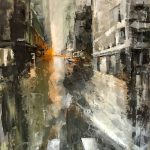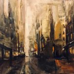 Al centro dell’opera di Maria Enrica Ciceri c’è la vocazione a rappresentare i paesaggi urbani delle metropoli occidentali. La sua indagine visiva si focalizza sull’imponenza delle costruzioni architettoniche, sulla vastità degli spazi, sugli elementi distintivi di ogni singola città, per cogliere il senso più profondo e invisibile dei grandi agglomerati urbani, nella loro condizione di continuo movimento e trasformazione. In scansioni prospettiche dalle pennellate intense, il forte gesto pittorico evidenzia l’esplorazione esistenziale del paesaggio urbano. L’artista lo fa con i toni inquietanti dei chiaroscuri, negli squarci di luce improvvisi sulle tele dipinte a collage, con tecniche miste o pittura a olio. Tra i soggetti privilegiati delle opere in mostra ci sono gli scorci prospettici delle strade, i palazzi in corsa verso il cielo, le insegne giganti.