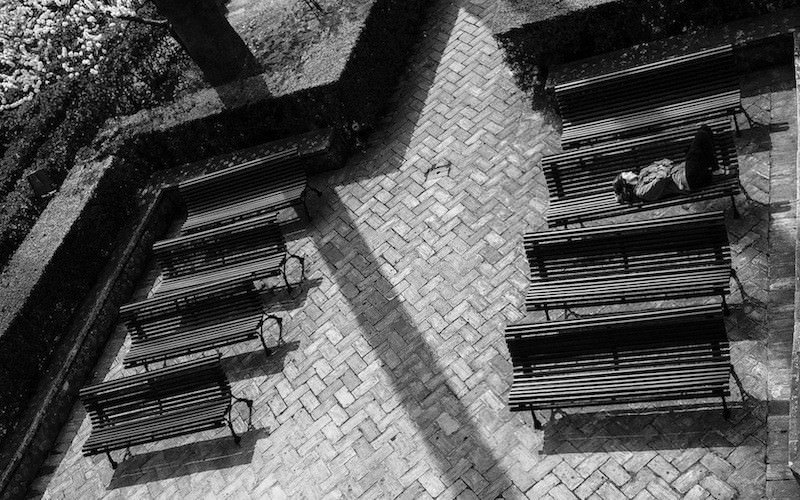 Tra la luce e la notte, tra il bianco e il nero, l’ombra smentisce allo sguardo creativo l’esistenza di confini netti e decisi, spalancando la soglia alla possibilità infinita della narrazione. A partire dalla visione sul paesaggio umano – in quanto abitato, attraversato, vissuto dall’individuo – l’occhio fotografico di Maria Francesca Tirelli mette a fuoco e restituisce ombre di umanità in dialogo intimo o aperto con lo spazio, cioè in relazione sentimentale, talvolta ludica, ironica o paradossale, con l’ambiente naturale o architettonico circostante.
