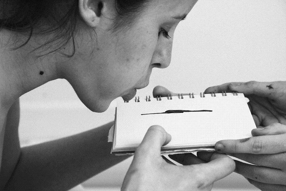 Il primo ambiente della galleria è caratterizzato dal soffio, un’azione delicata, il segno di una performance che cerca una relazione attraverso un dialogo muto: l’artista e una sua coetanea soffiano l’inchiostro sulla carta cotone disegnando così i contorni imprevedibili di una loro presenza nel tempo. Un lavoro, Dialogue Series. Blowing (2008), che si compone di una serie di disegni dove il colore progressivamente si assottiglia per lasciare spazio alle impronte astratte frutto del loro incontro, oltre che delle fotografie di documentazione.
