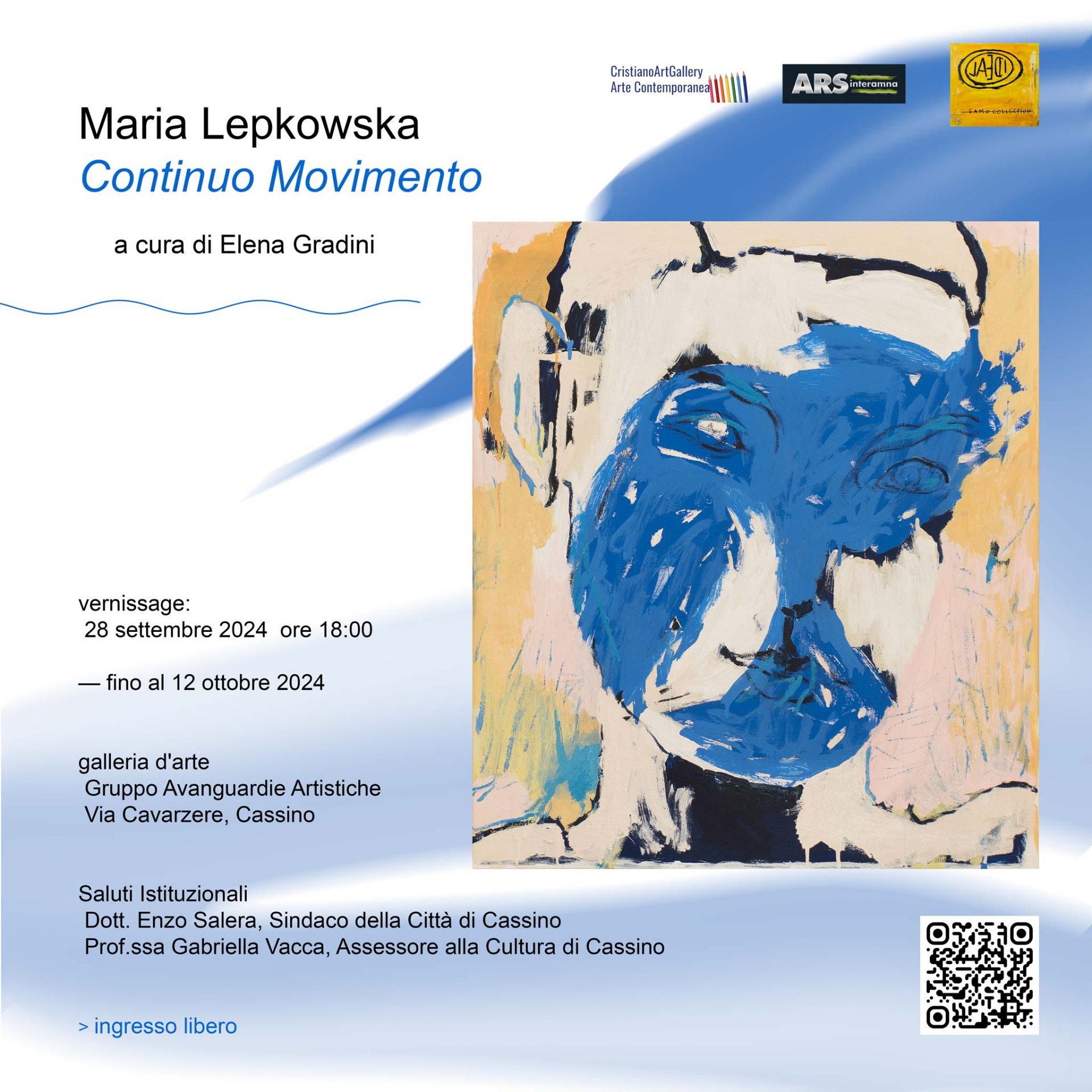La mostra personale 'Continuo Movimento' presenta al pubblico cassinate l’artista polacca Maria Lepkowska. Nata a Varsavia, si trasferisce nel 1994 in Italia, dove ha modo di proseguire i suoi studi accademici presso l’Accademia di Belle Arti di Frosinone, focalizzando la sua ricerca artistica sull’interconnessione dei vari mezzi espressivi legati alla pittura, la danza, l’action painting, la scultura, la videoarte, ricomponendo all’interno delle sue creazioni degli universi in costante ed effimero mutamento, come del resto è tutta l’esistenza umana. Per espressa volontà dell’artista la mostra avrà luogo a Cassino, città storicamente e affettivamente gemellata con la Polonia a seguito delle travagliate vicende belliche del secondo conflitto mondiale, oltre che per vicinanza di intenti con le altre realtà locali della Provincia di Frosinone con le quali l’artista ha già avuto modo in passato di farsi apprezzare (Alatri, Fossanova).