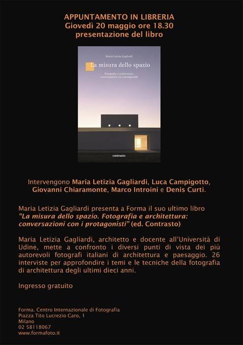 Maria Letizia Gagliardi presenta a Forma il suo ultimo libro. La misura dello spazio. Fotografia e architettura: conversazioni con i protagonisti. Intrevengono Maria Letizia Galiargi, Luca Campigotto, Giovanni Chiaramonte, Marco Introini e Denis Curti.