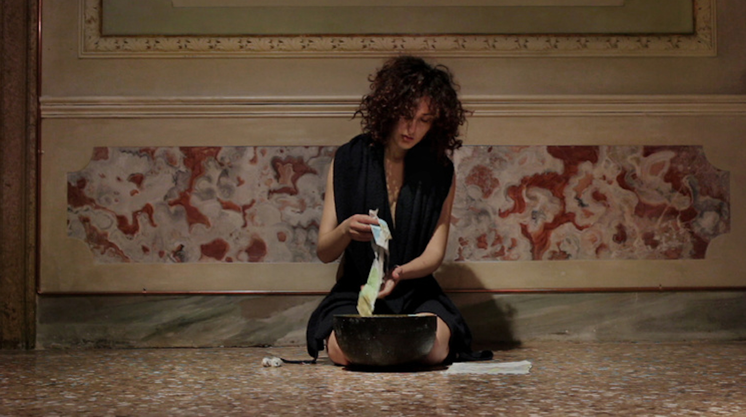 Nella seconda sala del Museo Marca su due monitor scorrono le immagini del già citato Purgatorio di Primavera e la performance Pangea. Qui l'artista strappa le pagine di un atlante geografico, le immerge una ad una in un catino d’acqua: la carta è immersa nell’acqua e lavata più volte fino a che si deteriora completamente.