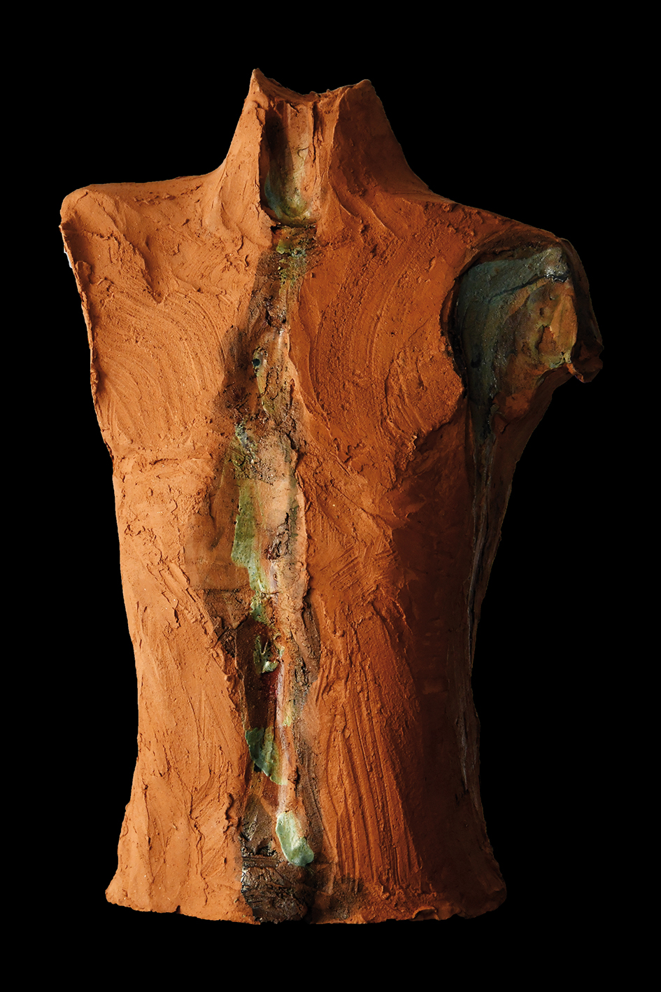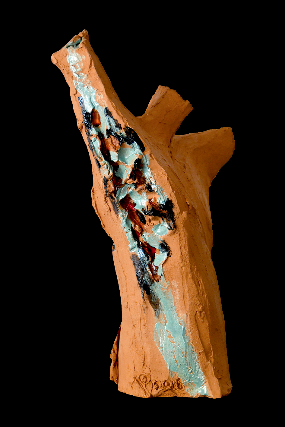 Anno dopo anno Maria Paola Amoretti è sempre più padrona sia della tecnica sia della plasticità della terra divenendo cantore di una poesia drammatica che le sue opere mettono ben in evidenza. Così il ciclo “Tronchi” si può, ormai, annoverare come un esperimento a tutto campo tra la ceramica e l’acquerello dove la Nostra mette in luce una matura identità artistica. Fin dalla sua opera in terracotta (materia che predilige nella povertà e sincerità della sua plasticità) dedicata a Santa Maria Giuseppa Rossello (ora esposta nella Collezione Santa Rossello a Savona) la scultrice mi ha stupito per la drammaticità narrativa, dai forti caratteri espressionisti dove si può, a mio avviso, ravvisare l’influenza di certa plastica popolare (dal colore delle pignatte domestiche ottocentesche). La scultura, oggi, è più che mai indefinibile, caleidoscopica, in un certo senso giramondo, migratore: è l’arte per eccellenza dei nostri tempi, non può essere classificata. Vive, è ubiqua. Queste opere della Amoretti mi paiono esercizi di libertà, contro ogni finzione. Negli acquerelli troviamo trasparenze, perspicuità, naturalezze fatte di linee accennate, abbozzate, tratteggiate con l’acqua e lievità e grazia di colore ma, comunque, nette, musicali, armoniose, euritmiche. Accenni di figure infinite, silenti, tra candore, incolpevolezza e peccato. Tutto ciò si traduce nella terracotta con “tronchi”, sia umani sia vegetali, violati spesso, lacerati dalle ferite della quotidianità. Forme tridimensionali al confine, in qualche modo, tra fiction e realtà dove il mistero e l’enigma di quelle ferite hanno echi antichi, ancestrali, primigeni dove il silenzio ne sottolinea il pathos e la luce scava la loro storia.