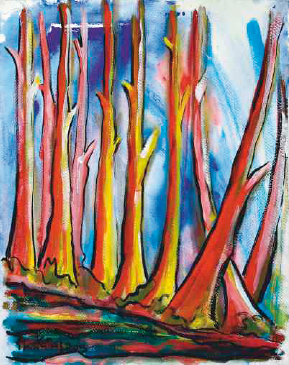 La Nostra forse vorrebbe raggiungere tale stato di poesia tra l’uomo e la natura, questa osmosi antica che origina emozioni come possiamo cogliere dagli acquerelli silenti, seppur potenti, della Libois che ha creato, anno dopo anno, una sua galleria di spazi, di luci radenti che fanno “muovere”, intrecciare quelle chiome verdi in primavera, rosse in autunno, in un inno silenzioso ma potente verso il cielo.