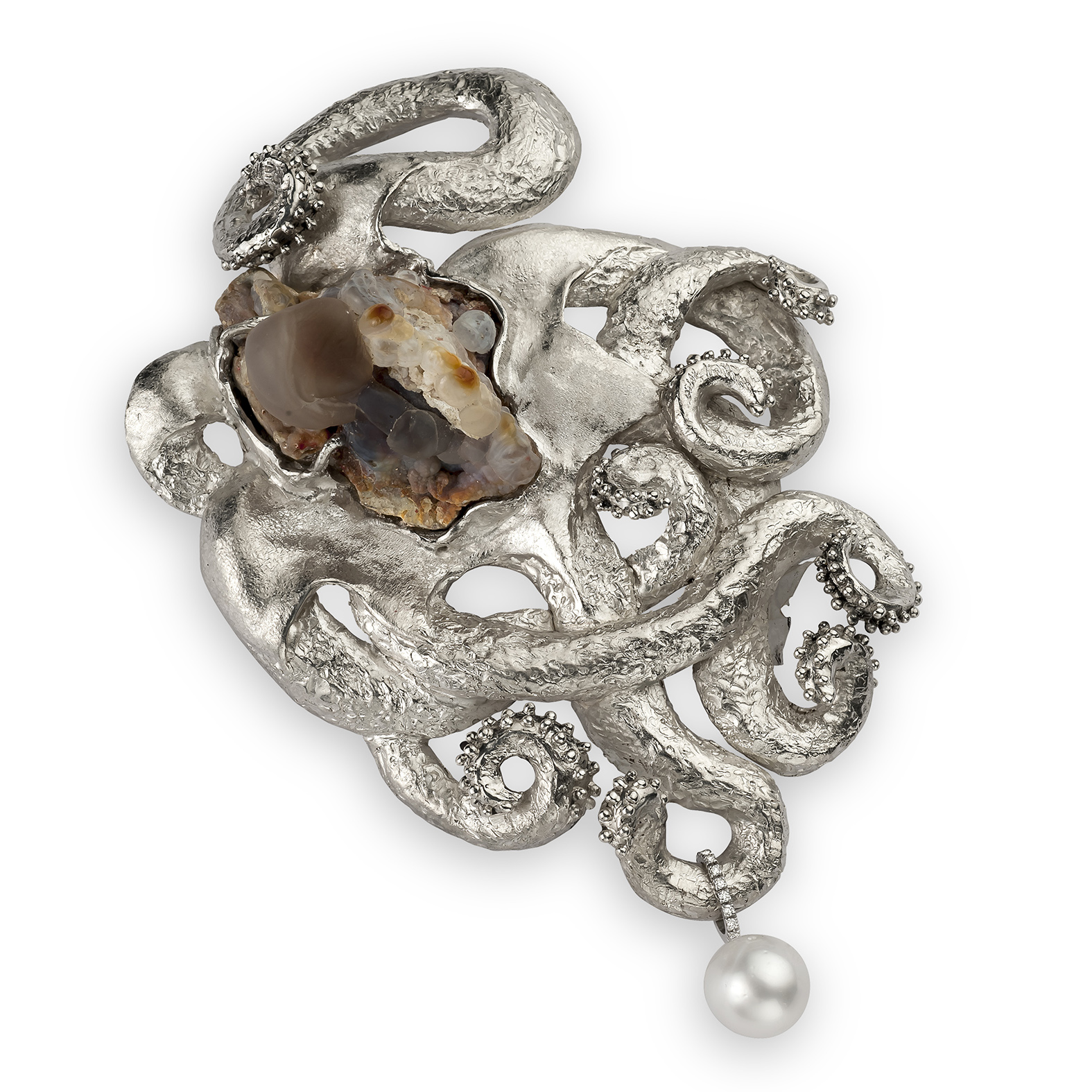 Si tratta di pezzi unici, realizzati a cera persa in oro, bronzo e argento e con pietre preziose e semipreziose dai tagli rari e particolarissimi o con elementi in porcellana modellata dalla stessa artista.