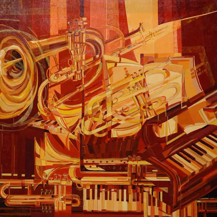“L’esposizione pittorica di Maria Rita De Giorgio si compone di una serie di grandi tele sul tema della musica, uno degli spunti di riflessione e dei modelli d’ispirazione della sua poetica. La predilezione per il jazz che traspare dalle sue opere vuole creare una sinestesia tra il linguaggio musicale e quello pittorico, entrambi espressione dello spirito umano. E Maria Rita, da sempre legata all’Africa (prima ancora di conoscerla) e all’anima nera, vuole in queste opere dare voce ai jazzisti autentici, ai musicisti neri come Louis Armstrong, Miles Davis, Charlie Parker e molti altri che la sera si riunivano nei bassifondi della metropoli newyorkese per ribellarsi attraverso la musica alle fatiche del lavoro disumano e allo sfruttamento cui erano sottoposti. Tramite la rappresentazione di strumenti musicali, di oggetti e scenari dalle cromie accese e vibranti che rimandano agli ambienti in cui i musicisti comunicavano la loro anima nera per riscattarsi dall’ingiustizia e dall’angheria subite, urlando il proprio spirito ancestrale e quello dei loro avi, Maria Rita trasfonde nello spettatore il desiderio di libertà e di pace con se stessi che questi uomini esprimevano attraverso la musica. Perché il nero, come il gatto scuro che in una delle tele appare lontano, distante e assente tra lo sfondo dei grattacieli e un pianoforte in primo piano, non vuole costrizione e, nonostante le catene, riesce alla fine a dar libero sfogo al sangue che gli ribolle nelle vene”.