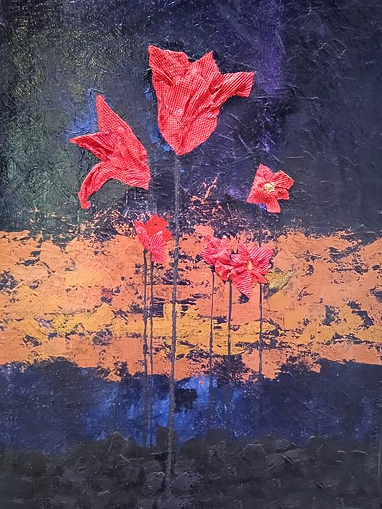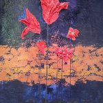 26 opere in mostra arricchite da una installazione in juta dipinta, il gesto artistico di Maria Rita Onofri è caratterizzato da una tecnica mista di stesura pittorica a spatola con applicazioni in metallo, dall’alluminio, all’argento passando per il rame e spaziano da formati piccoli 20x30 fino ad arrivare ad opere monumentali di formato 200x150.