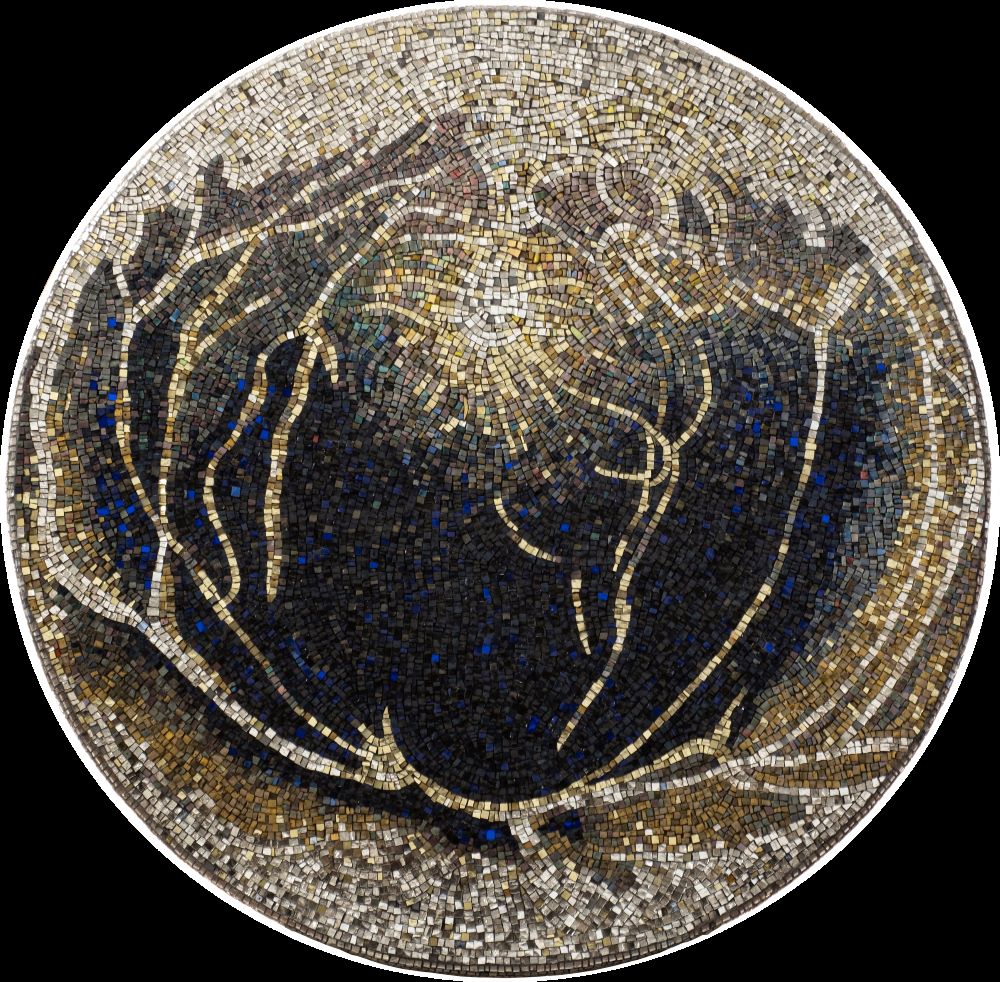 I mosaici di Tadei e i suoi arazzi raffinati sono un viaggio del pensiero umano alla luce delle conquiste scientifiche dell’oggi e le conseguenti intuizioni cui l’interpretazione artistica sa arrivare. Il colloquio con quel che ci circonda è in continuo divenire ma non c’è dubbio che per la scienza e, di seguito per le nostre coscienze, la chiave di volta sia stato il passaggio rivoluzionario dal sistema tolemaico a quello copernicano. Non più collocato al centro dell’esistente, ma relegato al ruolo di abitatore di un Pianeta fra i tanti, l’uomo si è sentito spiazzato e ha dovuto fare i conti con la propria debolezza, ignoranza e paura. Il nostro Pianeta non è che uno dei tanti mondi possibili (o impossibili) e neppure il migliore.