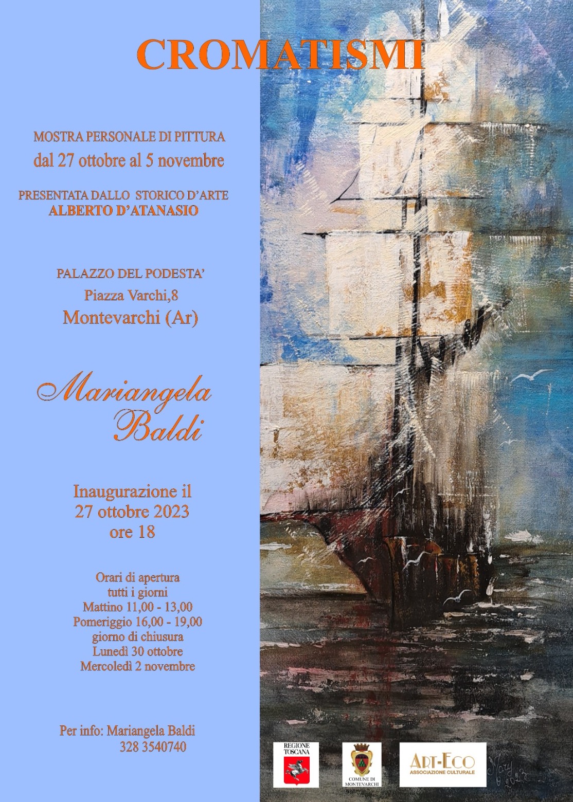 MONTEVARCHI – Dal 27 ottobre al 5 novembre 2023 il Palazzo del Podestà di piazza Varchi 8, a Montevarchi (AR), ospita “Cromatismi”, mostra di pittura di Mariangela Baldi.