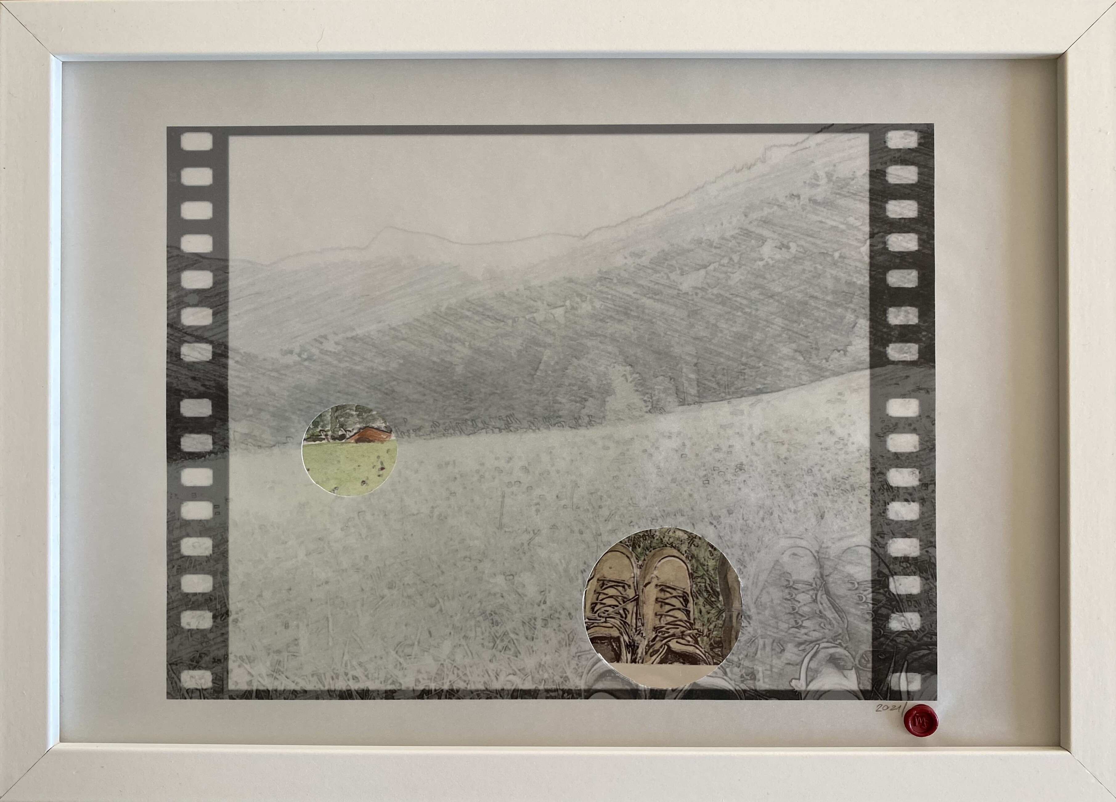 L’artista realizza progetti che coinvolgono il pubblico. Luoghi di nostalgia nasce dalla domanda fatta all’inizio del secondo lockdown “Dove preferisti essere ora?” La Schmid ne ha tratto opere su carta in tecnica mista riproducenti, su due livelli, le fotografie ricevute dai 28 partecipanti.
