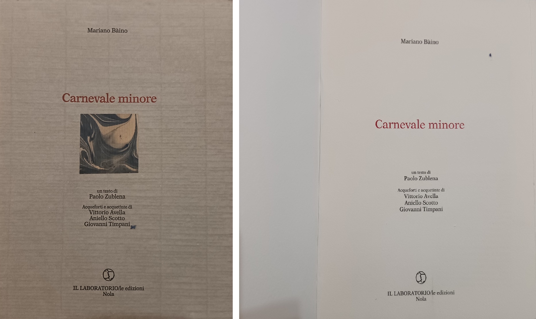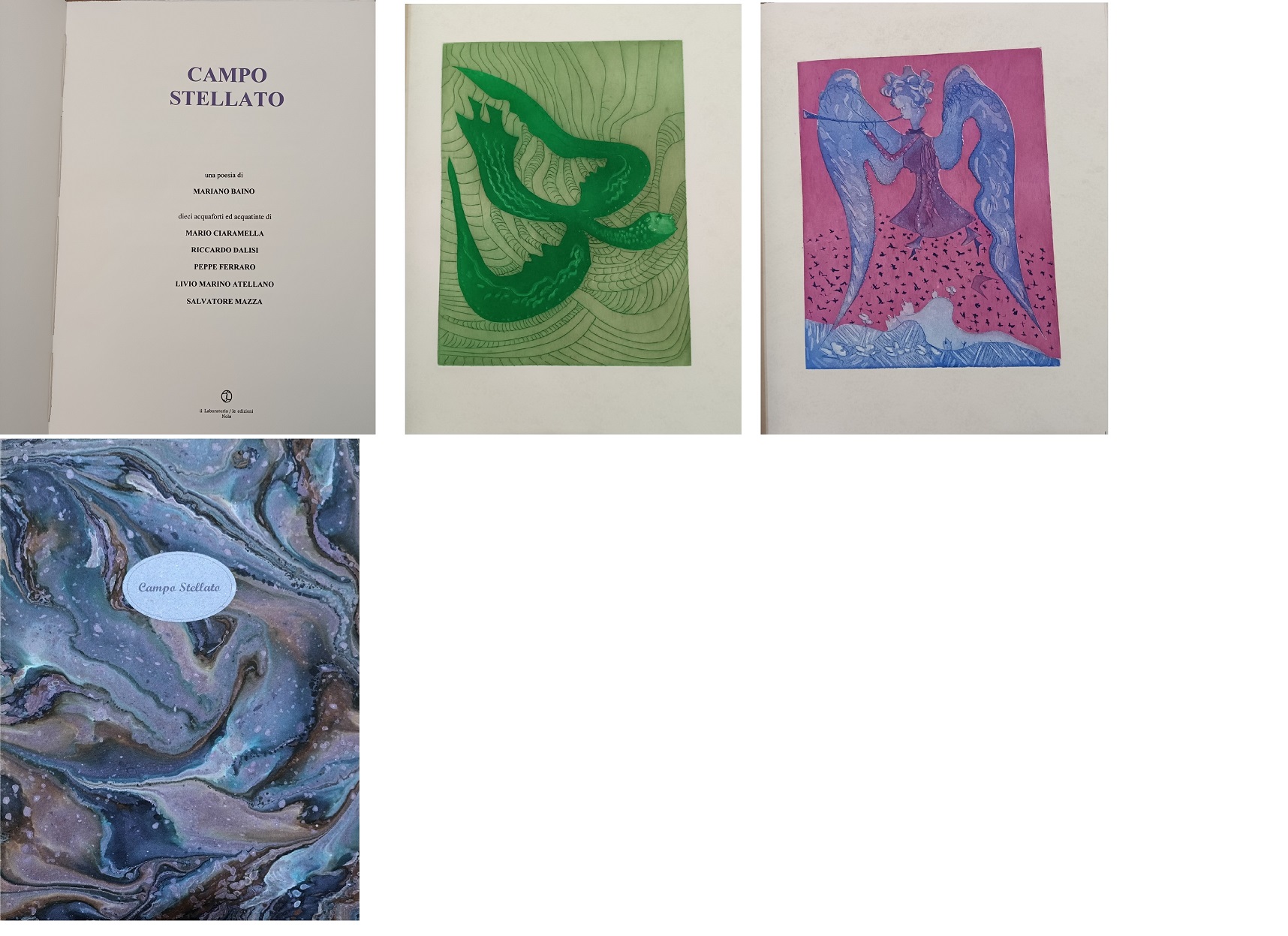 Cinque libri realizzati dal Laboratorio accostando un testo di Mariano Bàino a tavole di noti artisti: Campo Stellato, Carnevale Minore, Fax Giallo e poi Sparigli Marsigliesi, raccolta di testi poetici di Bàino con acqueforti e acquetinte di Vittorio Avella ed infine Ritratto immaginario di Hiccer, elaborato gioco combinatorio, con altri lavori grafici saranno in esposizione fino al 28 aprile.