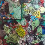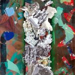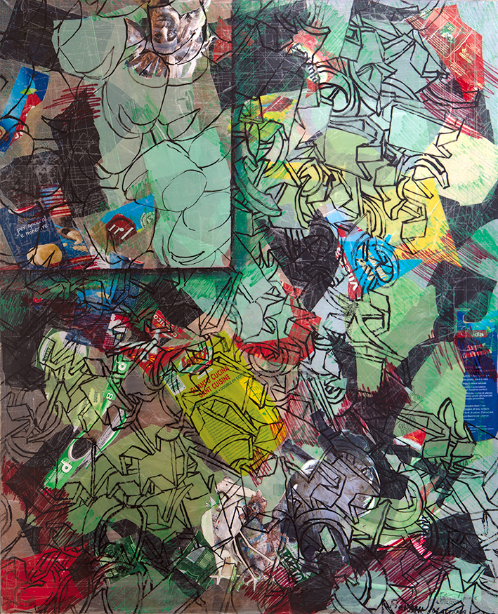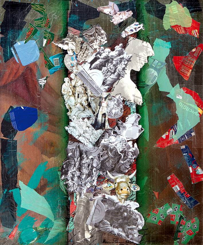 La crisi covid-19, è una occasione di cambiamento. Dicevo, diciassette lavori eseguiti con una tecnica nuova, sperimentale, che si fonda su trasparenze materiche, in parte neutre. Le sovrapposizioni di frammenti di carta ciclostilata, colla, colori acrilici, inchiostri di china nera e a colori, sono usati e posti con un personale sistema, con del materiale di riciclo, dei dismessi involucri alimentari. Resti di foto scontornate, resti di giornali cartacei, un mix circadiano trattato in punta di pennino arcaico, e robuste passate di corposa tinta, per materializzare, visualizzare spazi il più possibile lontani e profondi senza trascurare simboli e segni che affiorano dal mio passato e da un tempo il più remoto intuibile per un “sift” di significati, contenuti, segni, novità, sopra le mie radici. In sintesi: potenziamento dimensionale (uno stilema) dimensionista. Questa serie è nata in novembre 2020 e prosegue il discorso de “Gli scoppiati” illustrando una fase di ricerca fondata su valori estetici. Decantazione dell’impegno del vivere e aspetti della bellezza rintracciabile nei labirinti del dramma in luoghi e nebbie, o sfumature dell’anima, e nell’azione creativa frustrata, negata e dispersa, non solo dal covid-19, ma anche da una idea malsana di globalità consumista.