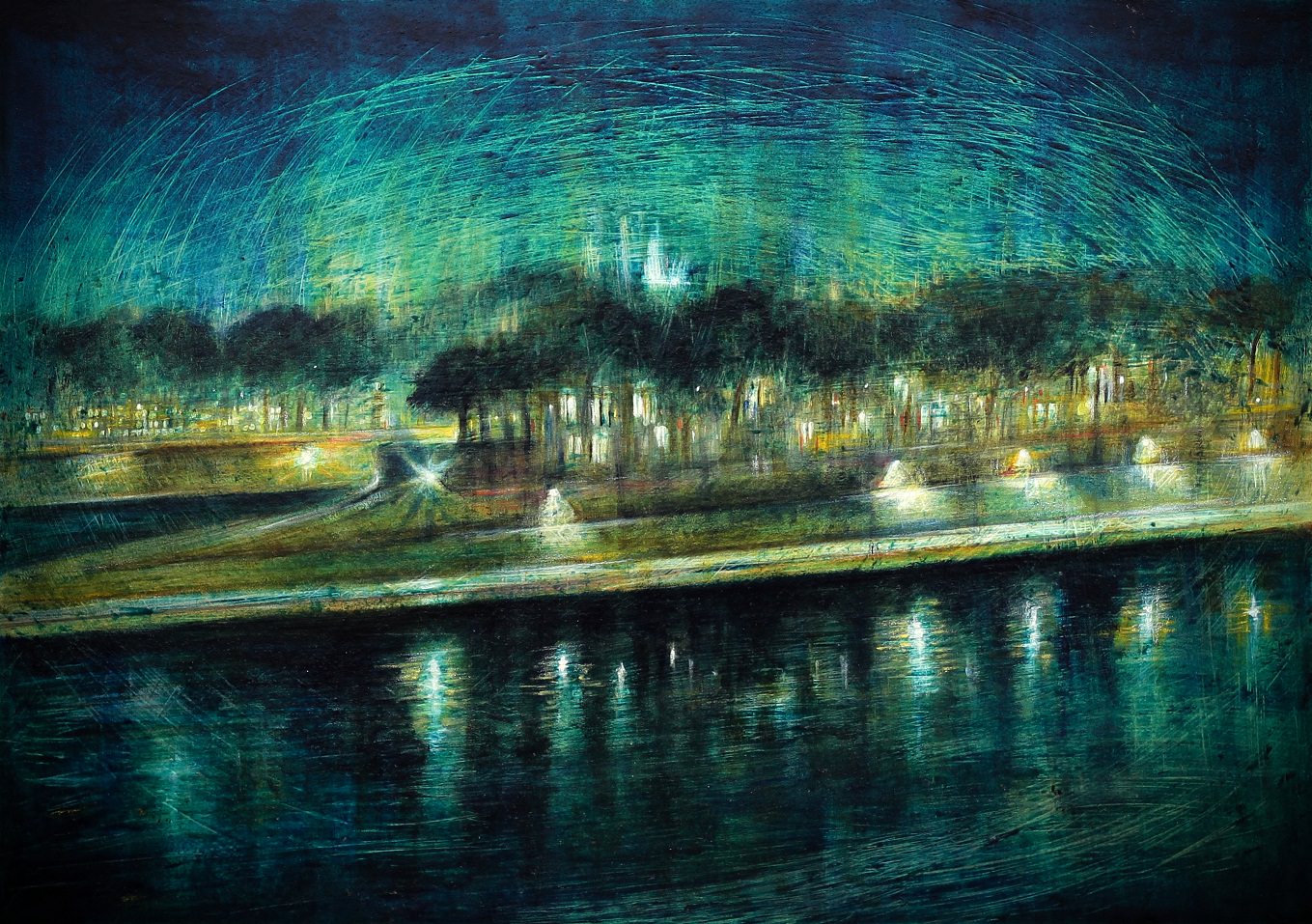 Come ha scritto Daniela Madonna, nello scritto pubblicato in catalogo, “I soggetti prescelti nella rappresentazione sono ambienti urbani captati in viaggio e quindi trasfusi in emozioni cromatiche nobili e musicali: l’oro ed il blu costituiscono la sinfonia di fondo in cui si inseriscono le note armoniche delle altre tinte. Il viaggio di cui si parla, vero o immaginario che sia, racconta storie notturne e giorni accarezzati dal vento, sguardi fugaci e riflessioni alla finestra. Calma, raccoglimento e curiosità emergono dalle tele, insieme ad una percezione del passaggio temporale carica di attese e possibilità”.