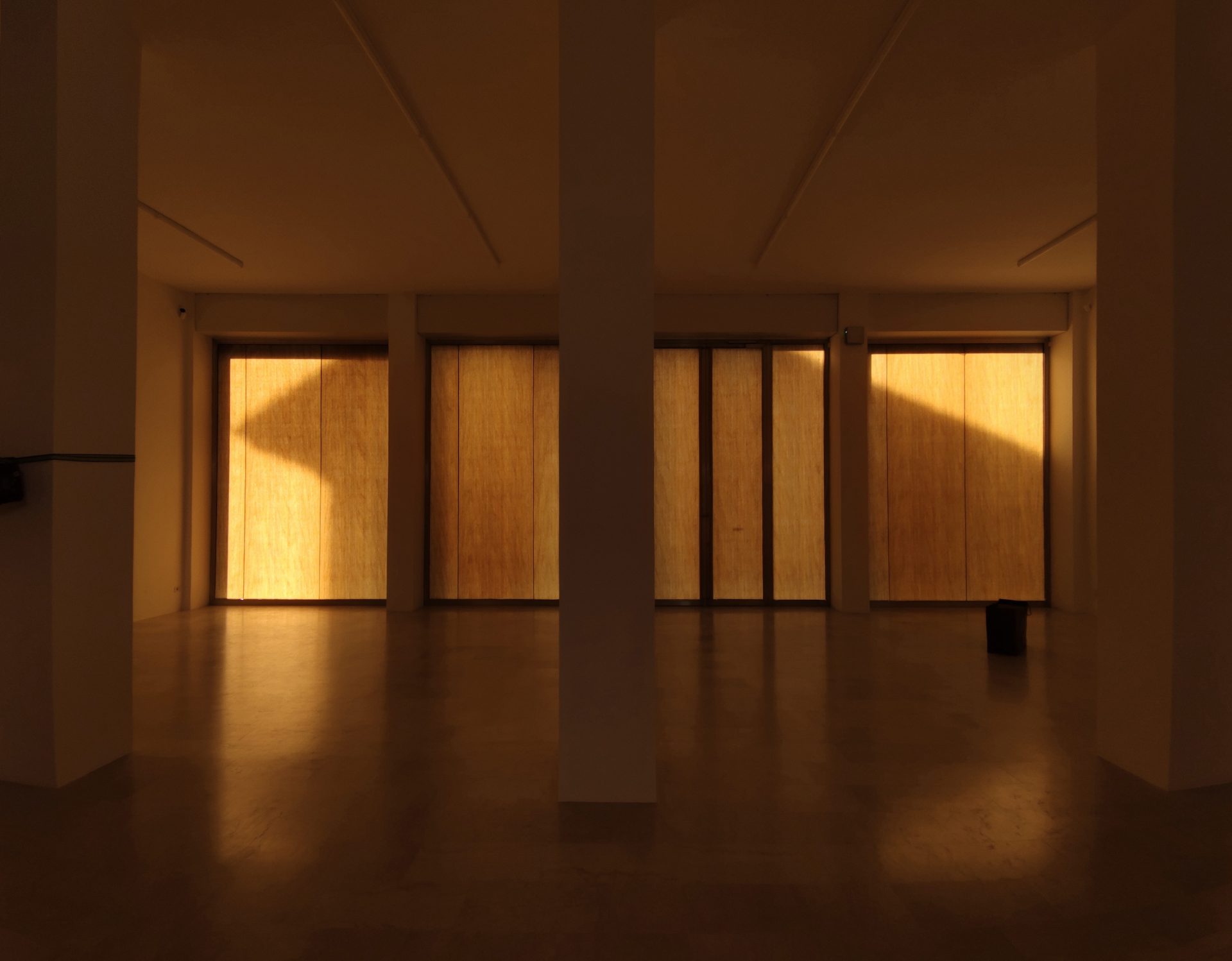 Senza sole è una mostra in penombra. La grande vetrata della prima sala della galleria, normalmente in trasparente dialogo con l’esterno, viene completamente ricoperta dagli artisti da una plastica adesiva con effetto legno di quelle che si trovano in tutti i negozi di articoli in plastica e per la casa. A volte utilizzata per ricoprire mobili e superfici da ravvivare, a volte utilizzata nelle stanze degli uffici dei call center, questo materiale configura scenari di scarse risorse e di scarso gusto, oltre ad oscurare la sala della galleria immergendola in una surreale atmosfera cupa e dai toni marrone/arancione. Con questa installazione e con la serie di opere scandite nelle due sale della galleria e in parte anche negli uffici, è da subito chiaro che la mostra prende spunto dallo spazio stesso della galleria, inteso come spazio fisico e architettonico, come luogo di lavoro vivo e attivo, per mettere in scena alcune delle riflessioni più tipiche del lavoro dei due artisti: il rapporto con il lavoro e il luogo di lavoro, lo spazio e la posizione di ciascuno, il rapporto col tempo e la durata delle cose.