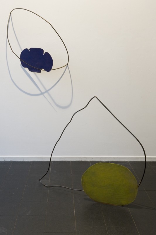 Farfalle, Dinosauro e Porta sono alcuni dei titoli delle opere in mostra: sculture in ferro che trovano posto a terra e a parete e che, tutte assieme, vivono e convivono le una accanto alle altre, le une “dentro” le altre, offrendosi nel loro essere creature dotate di identità propria ed al tempo stesso in grado di proporsi in gruppo e di aggregarsi ad altre simili. Nel caso specifico di Farfalle, gigantesche e vuote, tendono di delineare uno spazio che a sua volta è capace di espandersi, anche grazie all’ombra che naturalmente proiettano, sino a sfuggire ogni possibilità di controllo. Le dimensioni variano. Non c’è regola né ripetizione ma solamente sovradimensione tesa al raggiungimento di una condizione metafisica. L’idea, il concetto stesso di farfalla viene asciugato, ingigantito e potenziato. Nate da un gesto semplice, si portano appresso il sentimento del movimento che le ha generate, come se il tratto secco che ne delinea il corpo invece che sulla carta fosse stato tracciato in aria, o sull’acqua. Nel vuoto.