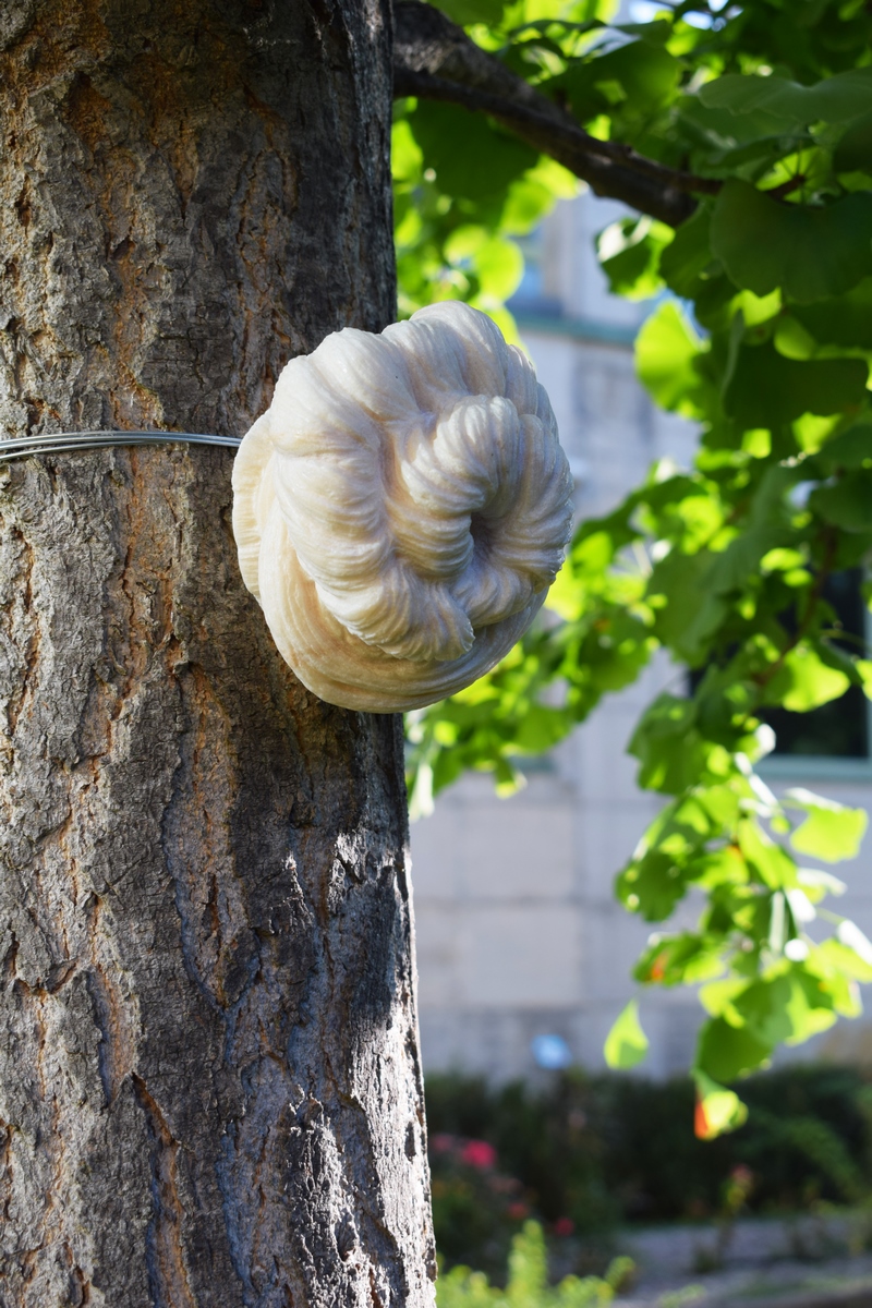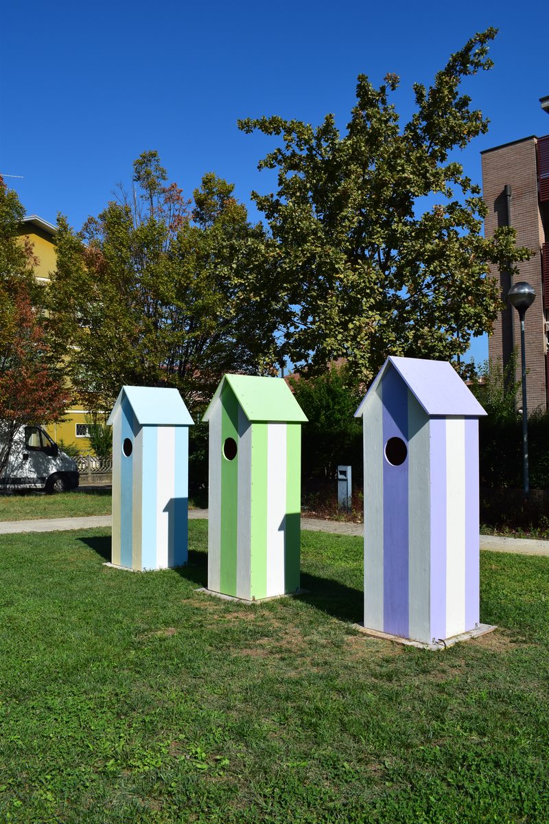 «La vita della donna – scrivono Francesca Baboni e Stefano Taddei – è continuamente costellata da ostacoli e difficoltà, dall’infanzia fino all’età matura. Riuscire a declinarle in tutte le sfaccettature è sicuramente una capacità che l’artista Marika Ricchi ha insita nella sua poetica. Non a caso abbiamo scelto lei per creare un percorso esplicativo di una vita al femminile. Attraverso una serie di installazioni, Marika Ricchi esegue un’attenta calibrazione di un vissuto, tracciando le linee di demarcazione tra lei stessa e l’esistenza. Nell’installazione “Bagno 87” (Piazza Lenin) l’autrice ricorda, anche visivamente, la propria provenienza romagnola. I colori delle cabine sono quelli di un tempo che è stato ma che, artisticamente, si ripropone in un luogo, Cavriago, che paradossalmente non ha il mare, creando un contrasto straniante ed evocativo. Nella serie “Gli occhi di Venere” (parco del Multiplo) si riportano differenti acconciature che ricordano il potere seduttivo che hanno tali pettinature. La posizione e i colori, a cerchio, di questi sei marmi ricordano le differenze che sussistono nella femminilità ma anche come tale parte del corpo viene spesso sfregiata e utilizzata per brutalizzare le donne. Dall’acconciatura di una persona si può intendere anche il carattere, la cura che pone verso la propria persona. E proprio contro questo sovente la violenza si scatena. In “Touch wood” (parco del Multiplo) siamo davanti ad una ricostruzione di un frammento di manualità che sa creare, mentre i segni sulla parte visibile del rilievo rimandano alla memoria, personale e universale e in “Pink Line” (parco del Multiplo) la corteccia si unisce al filo segnando tappe esistenziali. Sul pergolato viene evidenziata, ulteriormente, la violenza che abita la nostra attualità nell’opera “Piedi intrecciati” (Piazza Lenin). Si trovano difatti piedi di gesso colorati fattosi sculture, legati con corde. Un estremo monito alla costrizione nel proseguire, a quelle violenze che si arrecano ai corpi e che non possono che farci riflettere sulla nostra congiuntura. Sembriamo esseri progrediti, ma la bestialità sembra sempre pronta ad uscire».