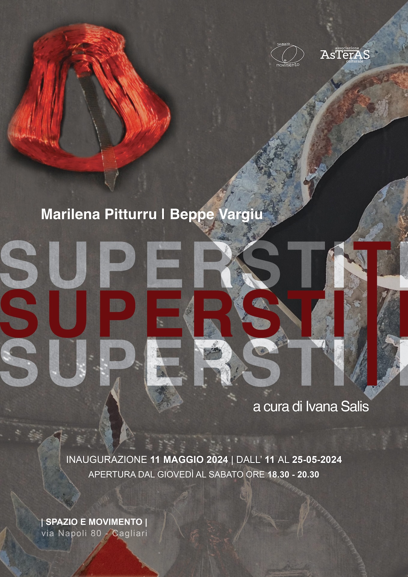 Spazio e Movimento chiude in bellezza la sua ottava stagione espositiva con “Superstiti”: la prima mostra bipersonale degli artisti Marilena Pittirru e Beppe Vargiu, che inaugura sabato 11 maggio, alle 18.30, nello spazio indipendente di via Napoli.
