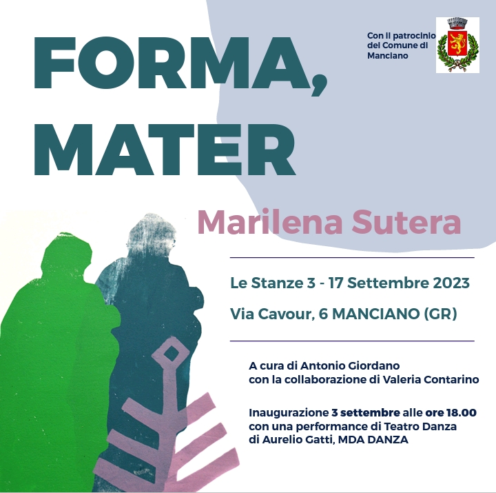 La mostra personale Forma, Mater – Marilena Sutera a cura di Antonio E.M. Giordano con la collaborazione di Valeria Contarino, sarà inaugurata domenica 3 settembre, dalle ore 18.00 alle 20.00 ne Le Stanze in Via Cavour 6 – Manciano (GR) e sarà visibile fino al 17 settembre dalle ore 10 alle 13 e dalle 15 alle 19.