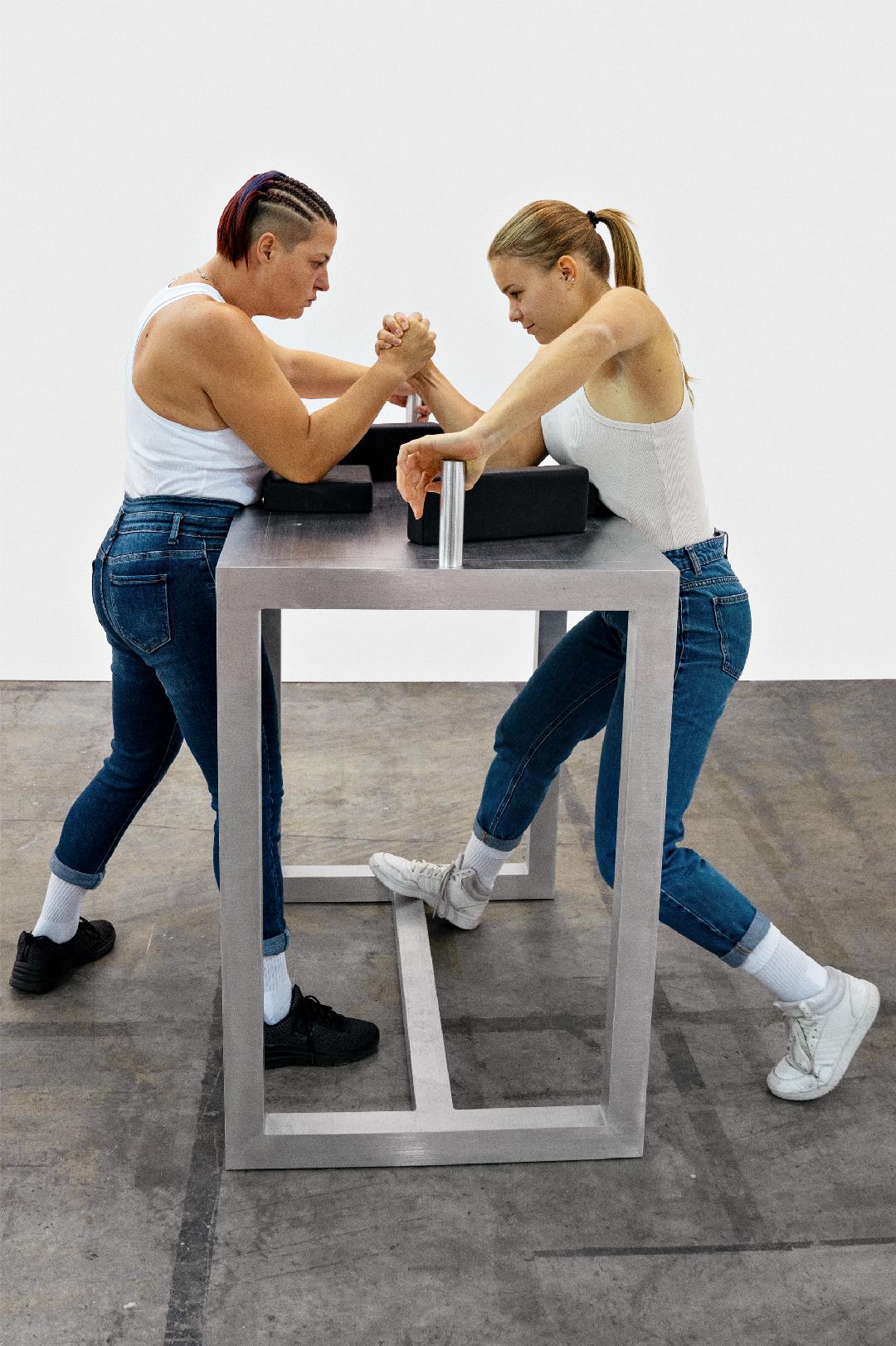 Concentration of Wealth & Power”. Nelle opere di questo progetto all’immaginario sportivo del ciclo di opere precedenti si aggiunge quello del sogno americano, fatto di sfide muscolari a braccio di ferro, shorts di jeans, oggetti in acciaio e coreografie di gruppo. Il lavoro rappresenta una società in rapido declino, dove la violenza viene estetizzata nel suo inarrestabile processo di