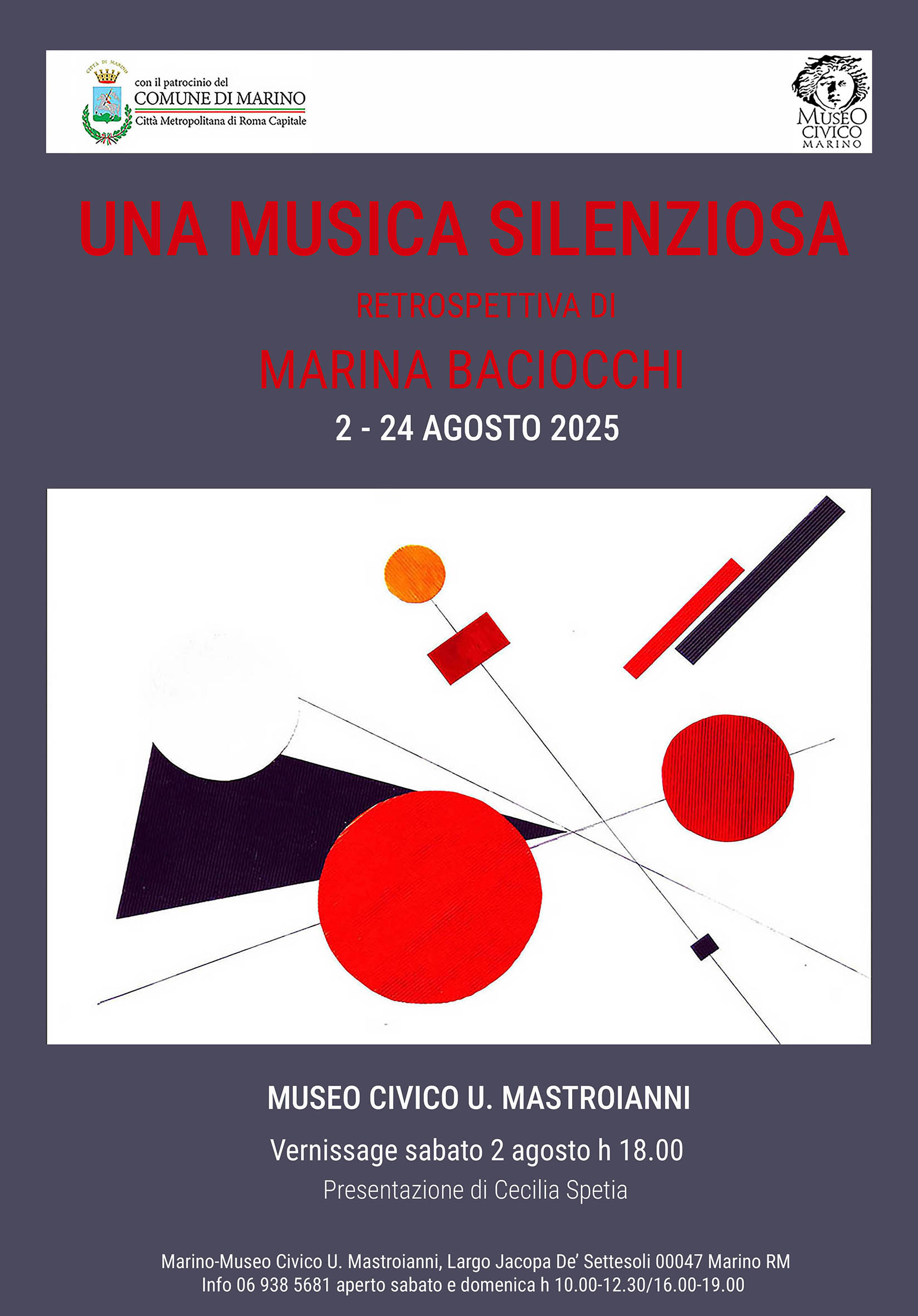 "Una Musica Silenziosa" si concentra sull'evoluzione del linguaggio pittorico di Marina Baciocchi nell'ultimo quindicennio. L'esposizione svela la sua profonda immersione nel mondo del colore e della materia. Le opere in mostra testimoniano una continua sperimentazione di tecniche e linguaggi, spaziando dall'astrazione lirica a composizioni che integrano elementi materici e tridimensionali.