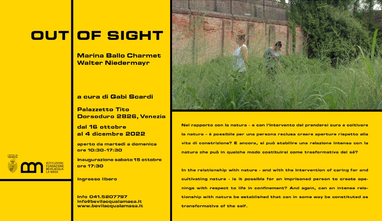 Dal 16 ottobre al 4 dicembre 2022 la Fondazione Bevilacqua La Masa presenta negli spazi di Palazzetto Tito la mostra Marina Ballo Charmet e Walter Niedermayr. Out of Sight, a cura di Gabi Scardi.
