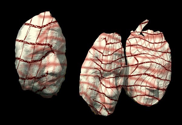 Il primo risultato è visibile nella storica librogalleria “Al Ferro di Cavallo” di Roma, dove le artiste espongono alcune loro opere. Il nucleo della mostra è l’installazione Interface, che occupa un’intera stanza della galleria. Appese nello spazio, vediamo molte maschere di varia grandezza create da Marina Büning. Su queste maschere sono proiettate, contemporaneamente, due sequenze di immagini e suoni realizzate da Maria Korporal: l’una costituita da un video, l’altra da diapositive. Le immagini sono fotografie di reti – elaborate mediante tecniche di computer animation – che, muovendosi in continuazione, giocano con le forme organiche delle maschere. Il tutto è accompagnato da una suggestiva colonna sonora. I volti assumono così espressioni sempre diverse e allo spettatore verrà probabilmente da chiedersi: chi sta guardando chi?