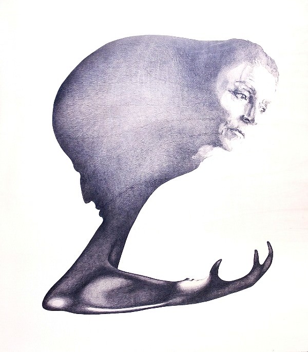 Da questo assunto, parte l’allucinata ricerca di Marina Burani che, come in un teatro anatomico, disegna con lenticolare esattezza l’anatomia del corpo umano, che poi ibrida e innesta con protomi animali «attraverso un segno di perfetta, capziosa incisività che la rende inquieta ed inquietante parente di Andreas Vesalius, il grande anatomista e sezionatore del Cinquecento».