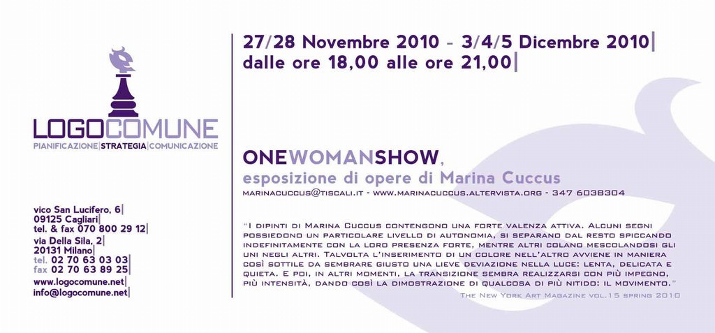 A dare il la, il 27 Novembre la mostra “OneWomanShow” di Marina Cuccus, di cui il New York Art Magazine scrive: “I dipinti di Marina Cuccus contengono una forte valenza attiva. Alcuni segni possiedono un particolare livello di autonomia, si separano dal resto spiccando indefinitamente con la loro presenza forte, mentre altri colano mescolandosi gli uni negli altri. Talvolta l'inserimento di un colore nell'altro avviene in maniera così sottile da sembrare giusto una lieve deviazione nella luce: lenta, delicata e quieta. E poi, in altri momenti, la transizione sembra realizzarsi con più impegno, più intensità, dando così la dimostrazione di qualcosa di più nitido: il movimento.”