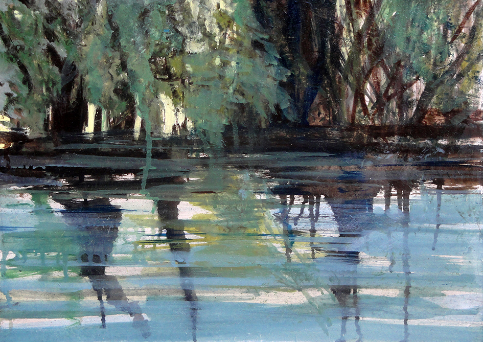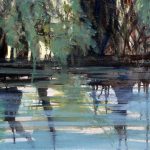 “…Come simbolo l’acqua è eterna, sta fuori dal tempo o, meglio, è prima del tempo e infatti per gli antichi è all’origine di tutti gli esseri viventi (Oceano padre degli dei). Cioè della vita, quindi del bene e del male e allora l’acqua è anche distruzione e morte, vale a dire il lato oscuro della personalità. La parola da spiegare è allora tempo perché l’eternità, in quanto ex-ternum, fuori dalla triade temporale passato-presente-futuro, può essere scalfita solo dal lavoro di chi, ed è l’artista, non accetta la linearità logica. Nel caso di Marina Falco la tematica ha anche un valore esistenziale con quello che sembra uno iato fra un prima, l’indagine sul corpo umano, e un dopo che è il presente con la centralità dell’acqua. Dal microcosmo al macrocosmo? Sì, credo sia una possibile chiave di lettura sottolineando la contemporanea presenza nei suoi lavori attuali di acqua e terra in quanto la prima, elemento indifferenziato, trova la sua dimensione e delimitazione solo nel rapporto con la seconda, isola o bosco o marcita della pianura padana poco importa. Un approdo, dunque, per cui l’acqua è anche viaggio, metaforicamente viaggio della vita, è dinamismo, come ricerca dell’anima o, se si preferisce, dell’essere, ed è silenzio in quanto mistero e riflessione. Ed è questa la dimensione scelta dall’artista nelle sue opere, quadri e disegni…”