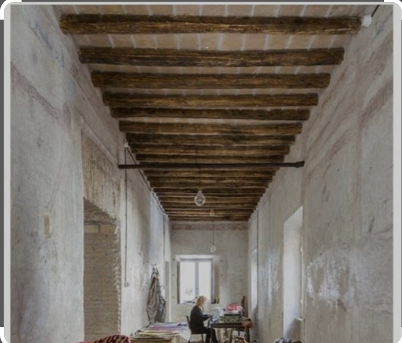 L'edificio del '700, tutelato dalle Belle Arti, ospitava un anonimo appartamento caratterizzato dalla tradizionale sequenza di spazi serviti e serventi. Nella ristrutturazione/restauro sono stati rimossi i contro soffitti e tutti i tramezzi ed eliminate le tamponature che nascondevano inaspettate aperture; sono state descialbate le pareti, protetti gli antichi intonaci, riportati alla luce i soffitti lignei, riscoperti i collegamenti interni originali. Durante il restauro delle pareti, effettuando il descialbo, sono riapparsi alcuni frammenti di un decoro a uccelli, cornici e sotto finestre a finti marmi e un frammento di paesaggio lacustre. Il laboratorio è ora adibito a lavori di riuso creativo in special modo collegato al riutilizzo di vecchi campionari o scarti di tessuto e carte da parati provenienti dallo storico negozio di Roma LELLI (dal 1924), situato in Via Tiepolo,