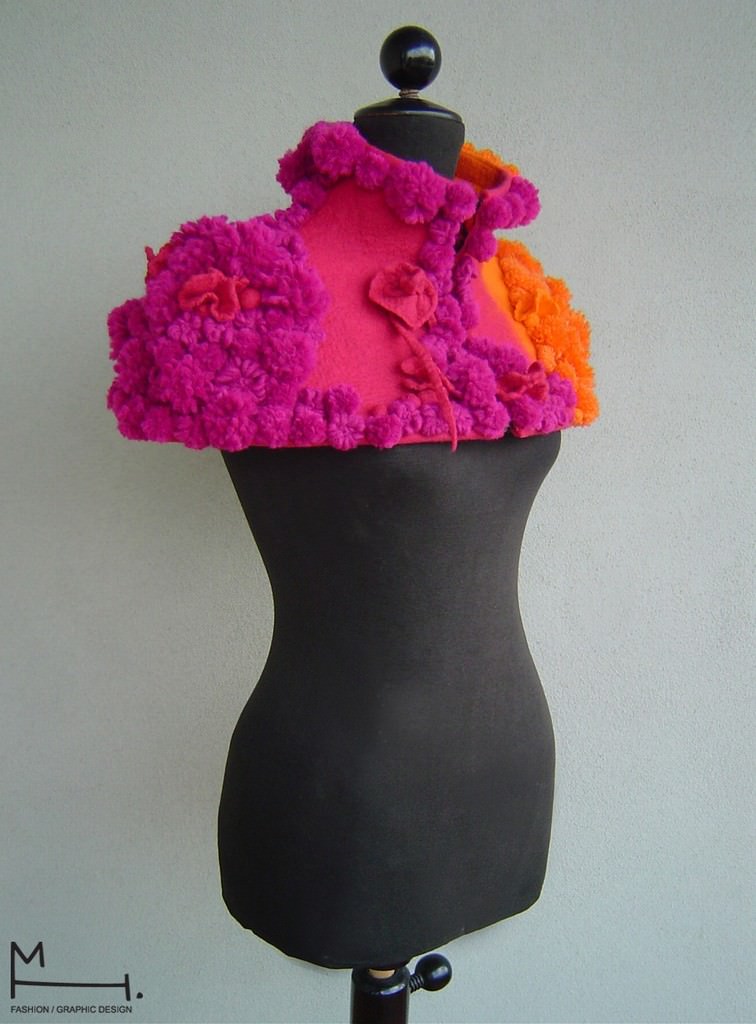 Tale tecnica permette di creare le strutture delle forme geometriche uniche come spalle strutturate, colli-scultura, guanti-manopole e scaldamani senza cuciture sempre originali, imperfetti a regola d’arte.